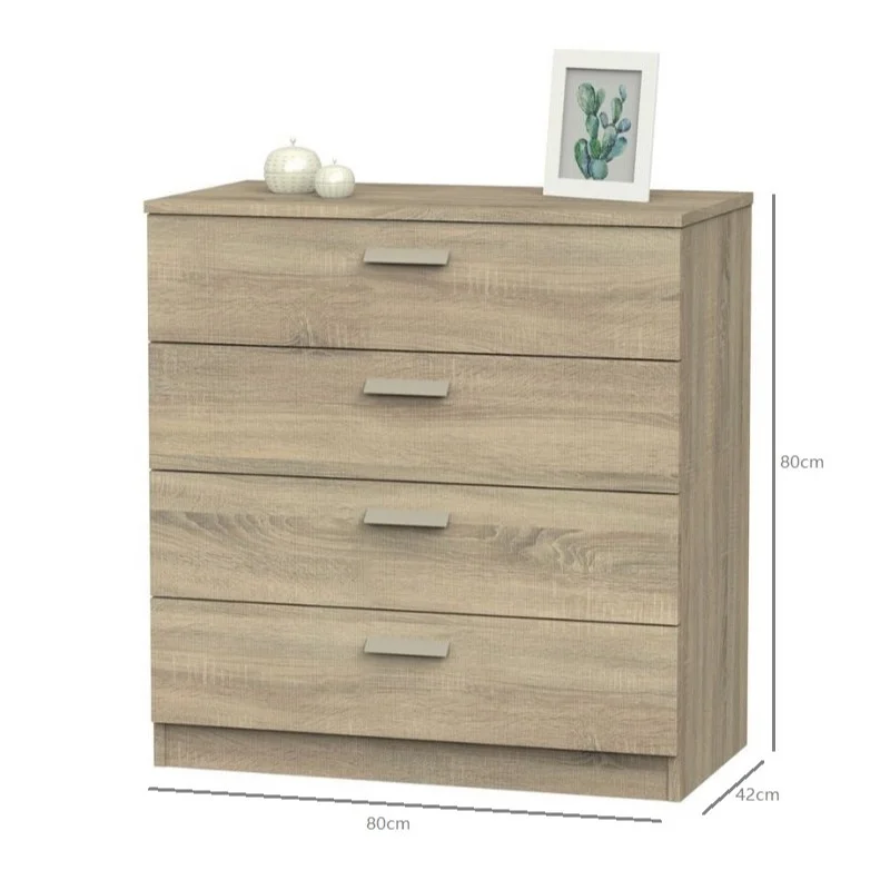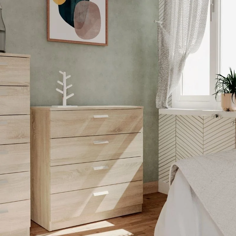 Elaborada en melamina 18mm, la Cómoda Cambu asegura un rendimiento duradero y robusto. Con 4 amplios cajones, cada uno equipado con correderas telescópicas, ofrece un almacenamiento eficiente y fácil acceso a tus pertenencias. Estos cajones permiten organizar ropa, accesorios u objetos personales de manera cómoda y ordenada. Gracias a su diseño espacioso, puedes aprovechar al máximo el almacenamiento en tu hogar, todo mientras mantienes una apariencia organizada y elegante. La Cómoda Cambu es la opción ideal para quienes buscan una mezcla de estilo vintage y funcionalidad práctica.