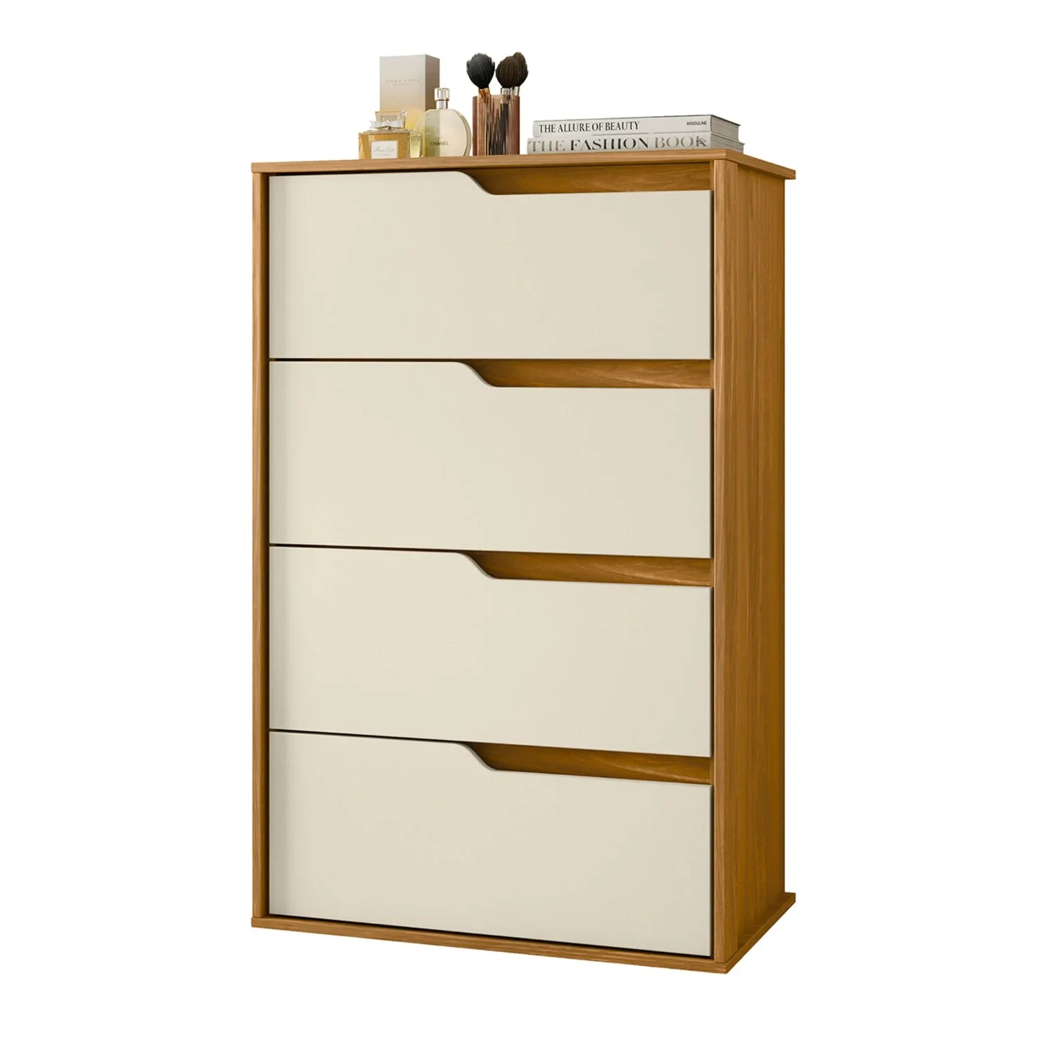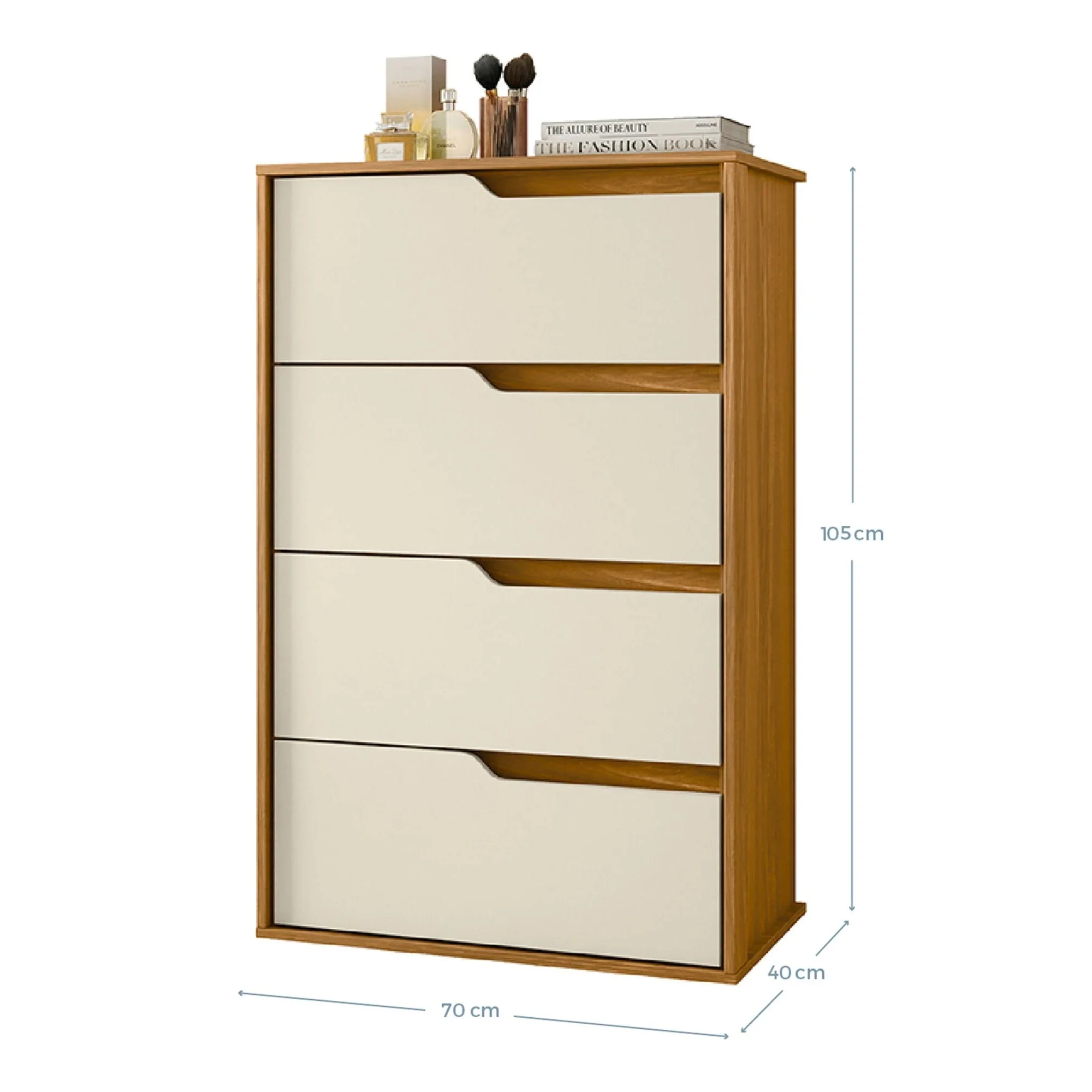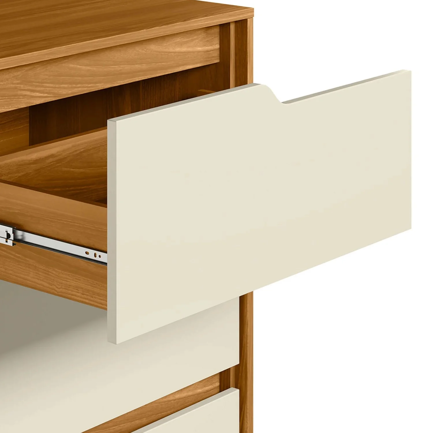 La Cómoda Detroid combina la pureza del color blanco con la calidez del tono miel, creando un contraste elegante y acogedor para cualquier dormitorio. Su diseño vertical maximiza el aprovechamiento del espacio y mantiene una estética limpia gracias a la ausencia de tiradores. Fabricada en melamina de 18 mm, presenta un estilo moderno y una estructura robusta pensada para perdurar.