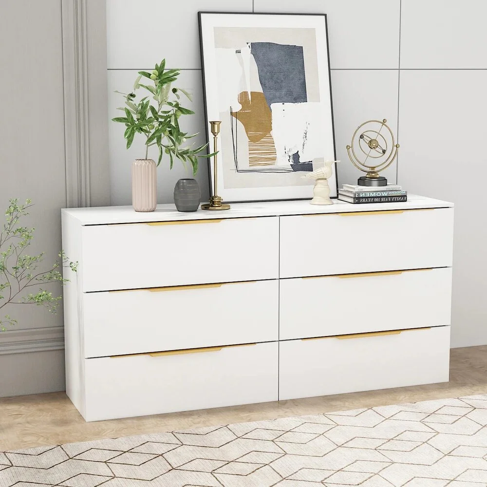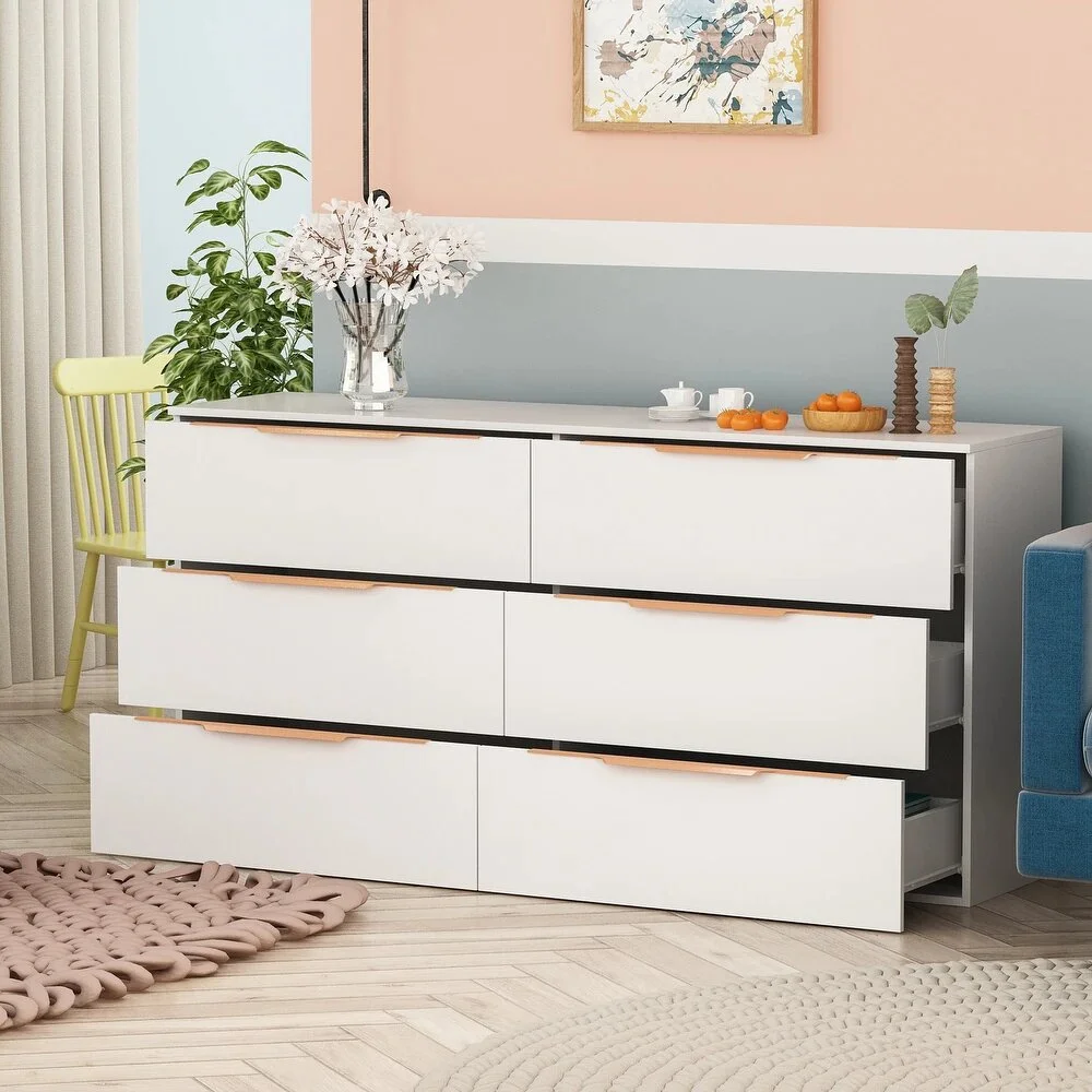 Equipada con seis amplios cajones con correderas telescópicas, la Cómoda Grecia proporciona un almacenamiento espacioso y de fácil acceso para ropa, accesorios y todo tipo de objetos. Su formato horizontal la convierte en una pieza ideal para combinar con espejos o elementos decorativos en la parte superior, manteniendo el orden con estilo en cualquier dormitorio.
