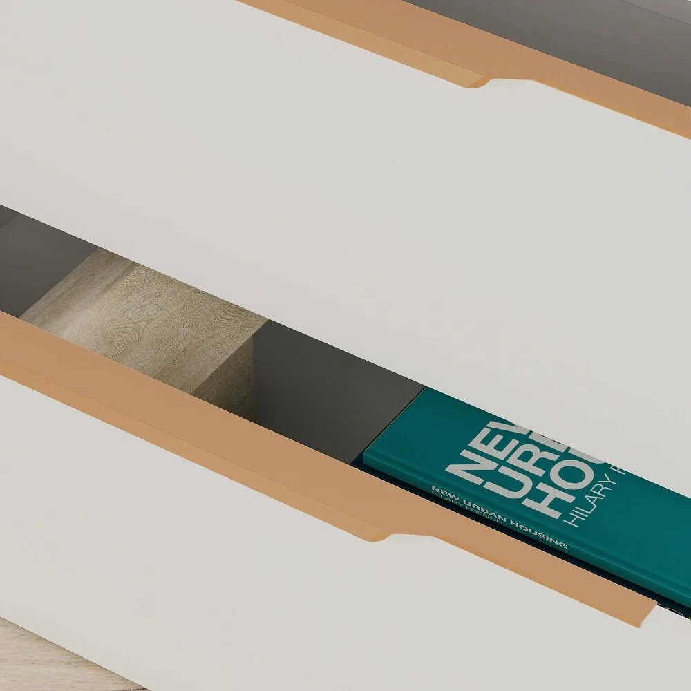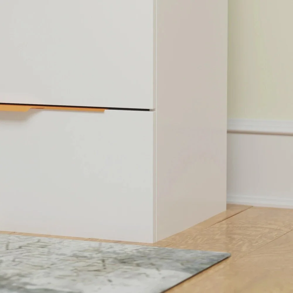 La Cómoda Grecia combina elegancia y funcionalidad en un diseño moderno de líneas limpias. Su estructura rectangular y horizontal, en color blanco, transmite amplitud y luminosidad. Los tiradores dorados aportan un toque sofisticado que realza su estética. Fabricada en melamina de 18 mm, ofrece un acabado sólido y resistente, pensado para durar.
