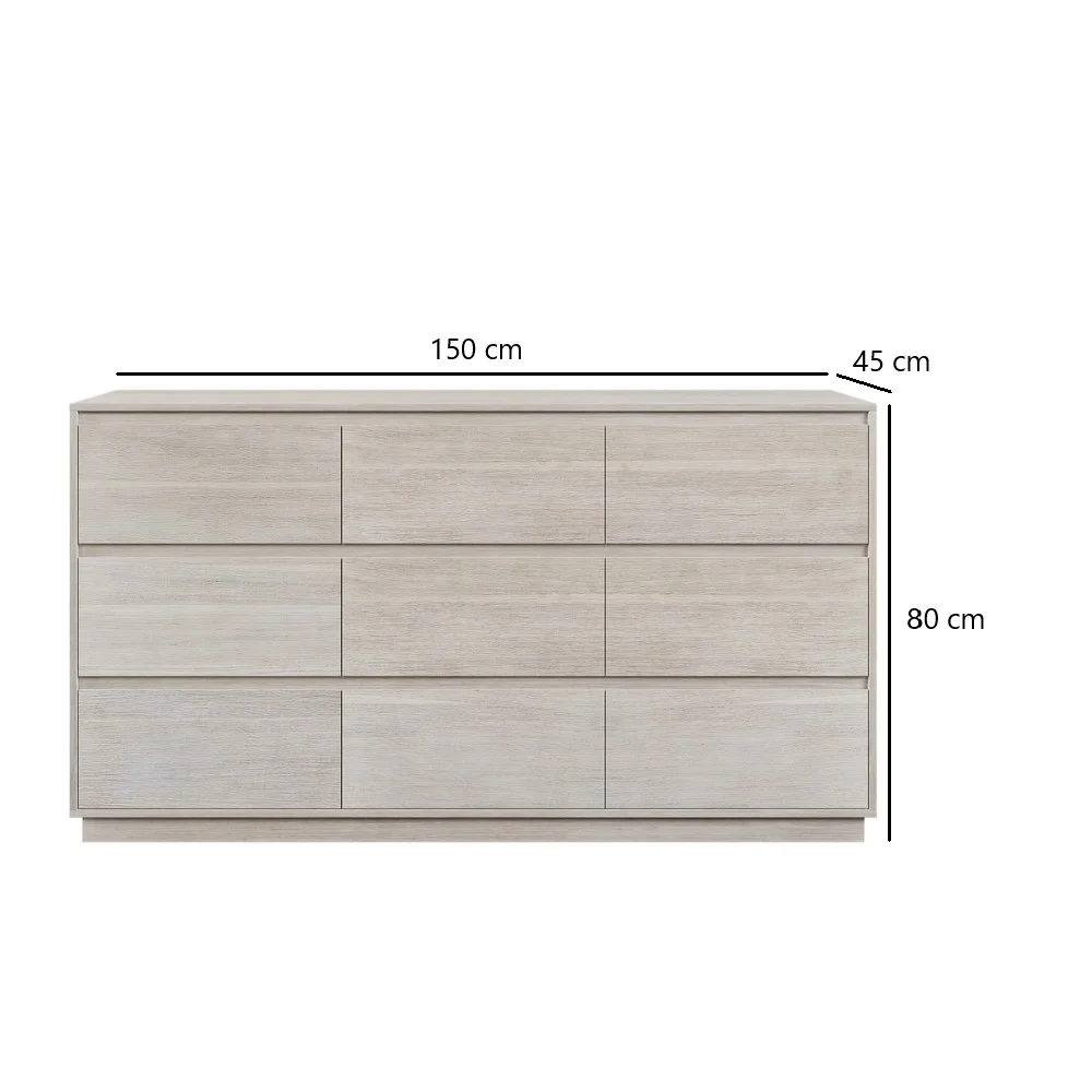 La Cómoda Mestre está diseñada para ofrecer una solución de almacenamiento amplia y eficiente. Con un diseño horizontal que maximiza el espacio, cuenta con nueve cajones espaciosos, cada uno equipado con correderas telescópicas para un deslizamiento suave y acceso cómodo. Fabricada en melamina de 18 mm, garantiza durabilidad y resistencia, convirtiéndose en una pieza confiable para el uso diario. La Cómoda Mestre es ideal para mantener tus pertenencias organizadas mientras aporta un toque de modernidad y elegancia a tu hogar.