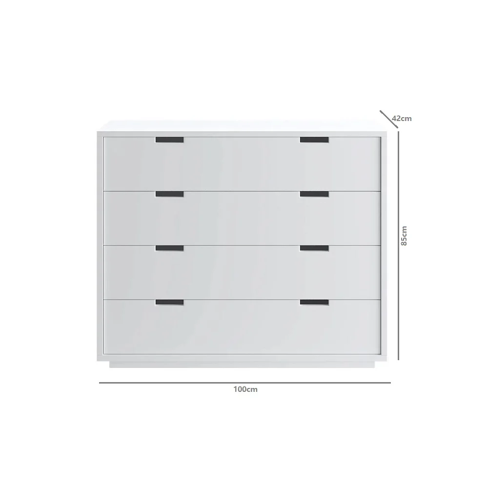 La Cómoda Miranda combina a la perfección un diseño moderno y minimalista, ideal para quienes buscan un mueble funcional sin perder la elegancia. Su acabado en color blanco aporta luminosidad y frescura al dormitorio, convirtiéndola en una pieza versátil que armoniza con cualquier estilo de decoración. Su diseño sin tiradores refuerza la estética limpia y sofisticada, manteniendo un aspecto uniforme y contemporáneo que realza la sensación de orden y amplitud en el espacio.