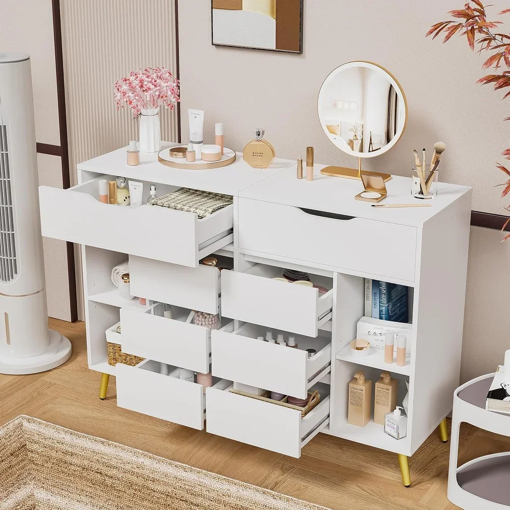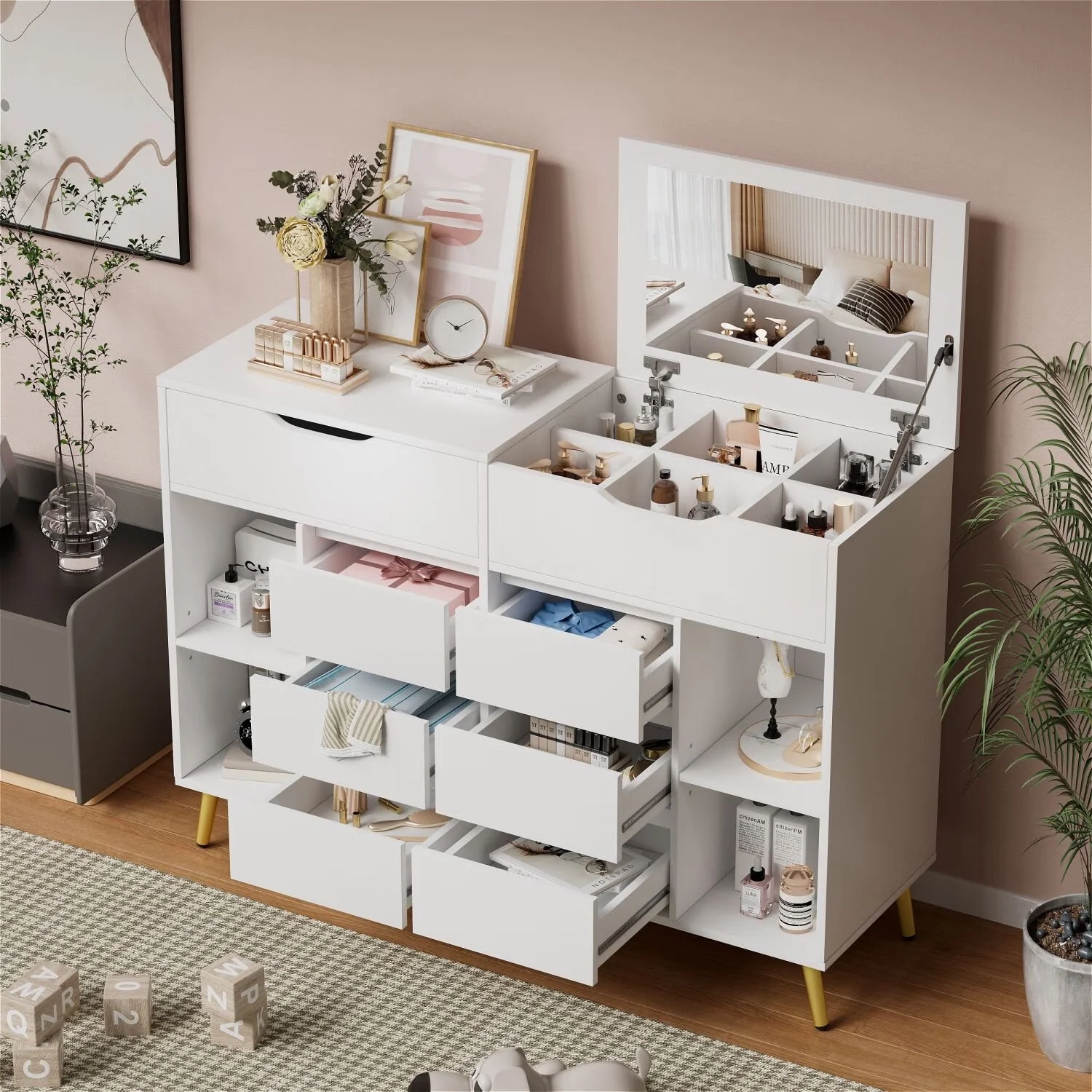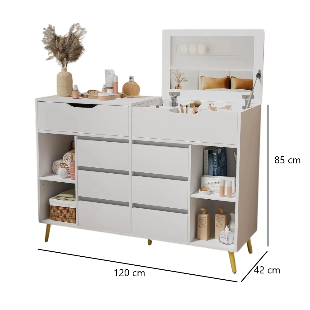 La Cómoda Novoa combina la practicidad de una cómoda con la utilidad de un tocador, creando una solución multifuncional perfecta para optimizar tu espacio. Cuenta con un espejo incorporado que facilita tus rutinas diarias, mientras que su diseño incluye un cajón principal y seis cajones más pequeños, todos equipados con correderas telescópicas para un deslizamiento suave y accesible. Además, dispone de espacios incorporados y un organizador debajo del espejo, ideal para mantener tus artículos esenciales organizados y al alcance. Fabricada en melamina de 18 mm, garantiza durabilidad y resistencia, convirtiéndose en una pieza esencial para quienes valoran la funcionalidad sin renunciar al estilo.