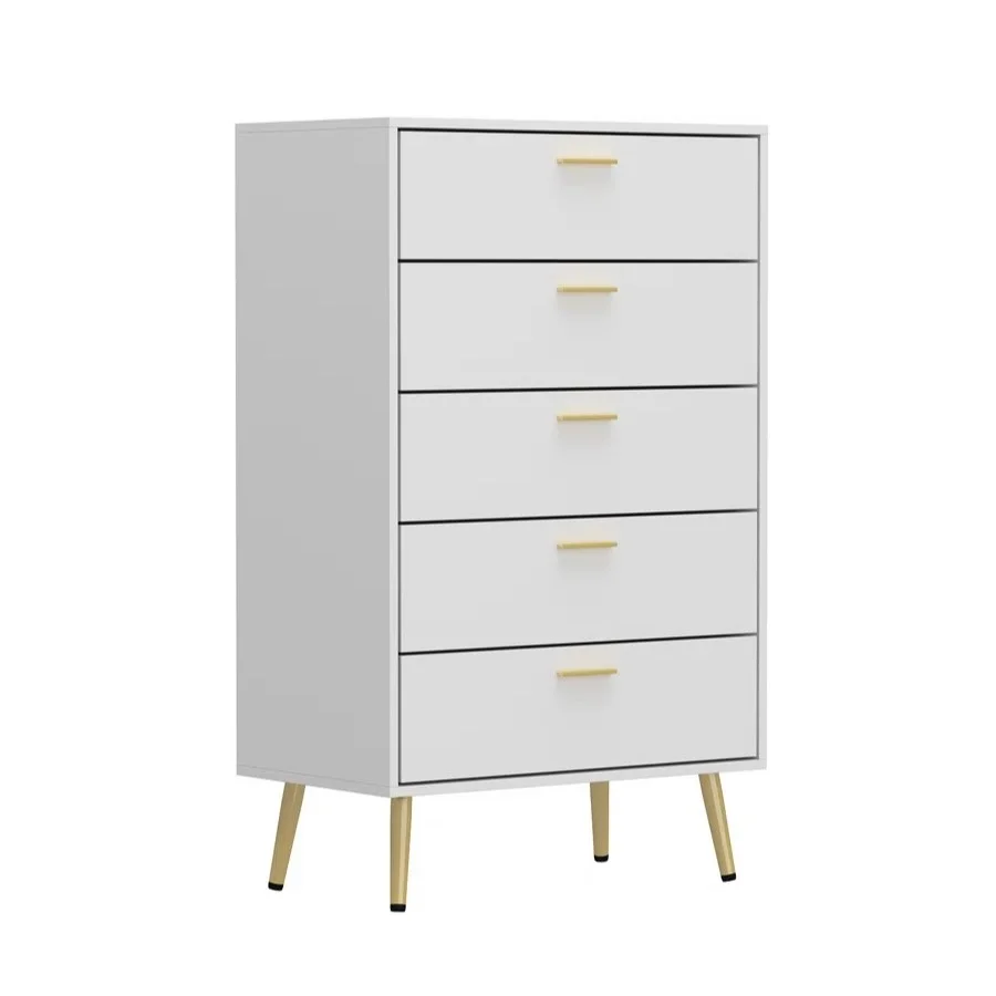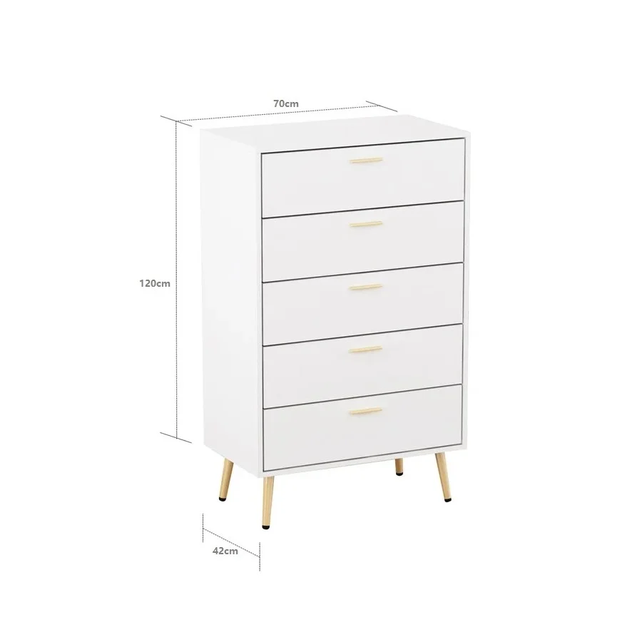 La Cómoda Paty es un mueble de dormitorio que combina modernidad y elegancia en un diseño pensado para destacar. Su acabado en color Blanco aporta luminosidad y frescura, mientras que los tiradores y patas en color Dorado añaden un detalle sofisticado y decorativo que realza su estilo. Su estructura vertical le da una apariencia estilizada que aprovecha mejor el espacio sin perder presencia.