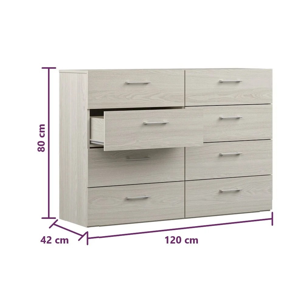 La Cómoda Reez está pensada para quienes buscan organización y capacidad de almacenamiento sin sacrificar estilo. Equipada con 8 amplios cajones, brinda un espacio más que suficiente para mantener en orden ropa, accesorios, lencería o textiles, convirtiéndose en un aliado esencial para el día a día. Gracias a sus correderas telescópicas, cada cajón se desliza con suavidad y firmeza, soportando un uso constante con total comodidad. Su estructura robusta en melamina de 18 mm garantiza un mueble resistente, duradero y de fácil mantenimiento, ideal para acompañar la rutina familiar. Una opción práctica y elegante para quienes buscan funcionalidad, capacidad y estilo en un solo mueble.