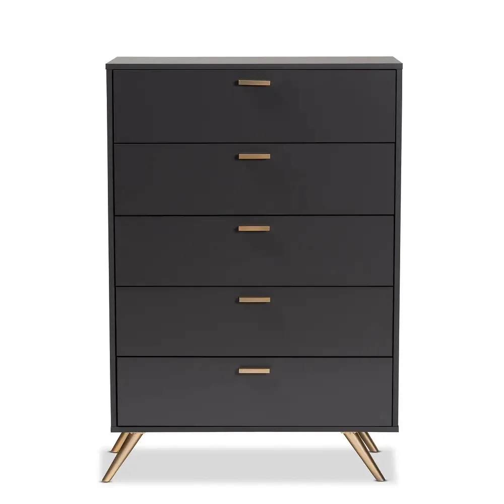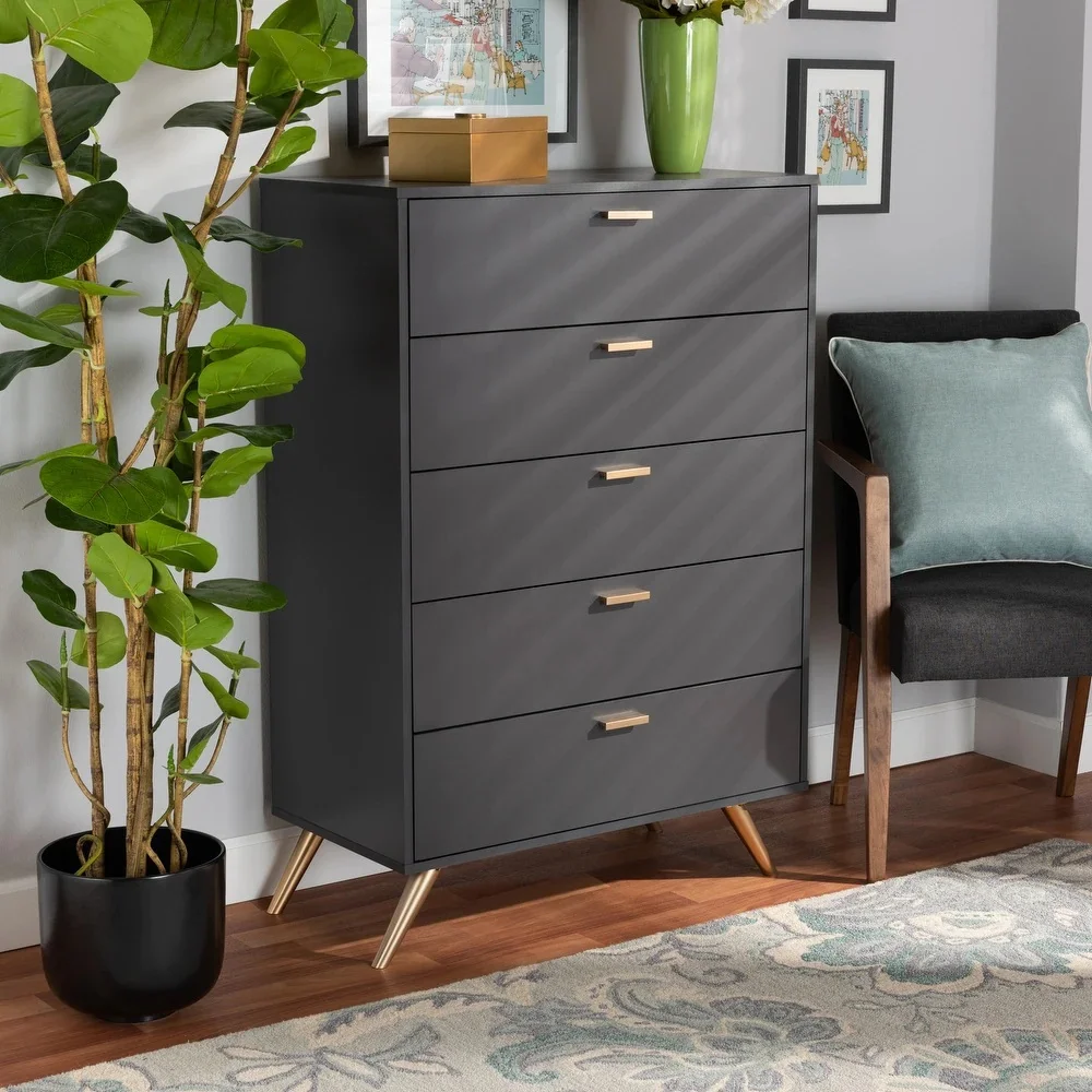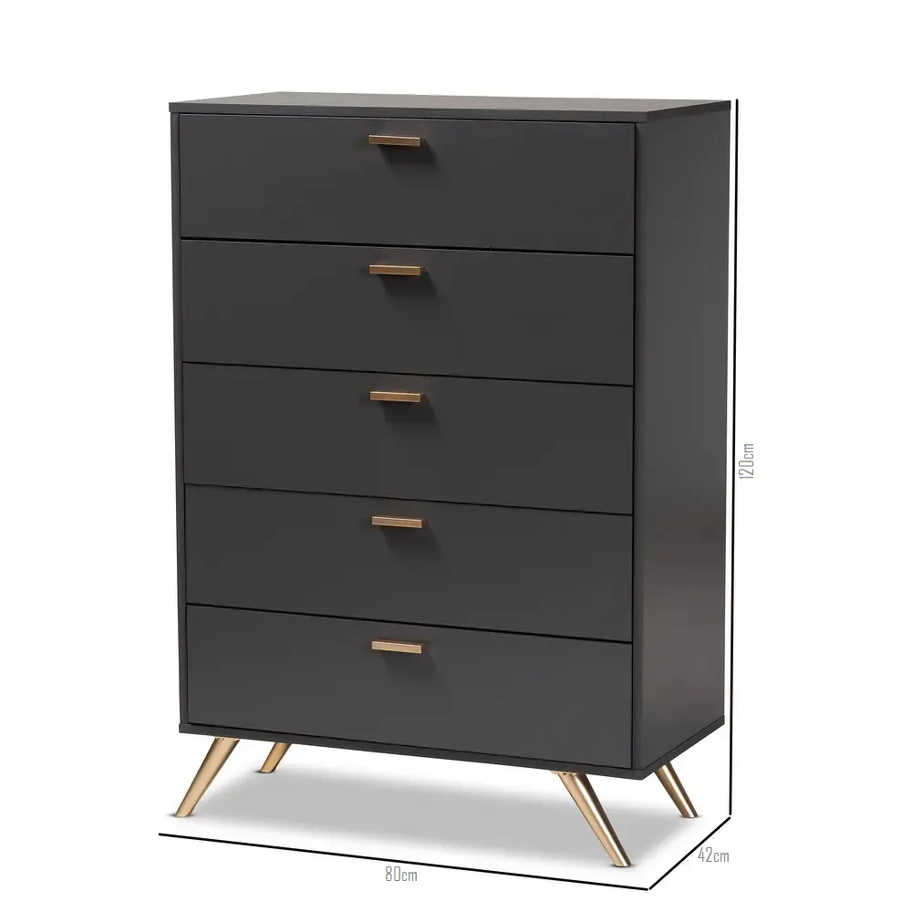 La Cómoda Shira combina practicidad y estética en un solo mueble. Equipada con 5 amplios cajones, ofrece un gran espacio de almacenamiento para ropa, accesorios u objetos personales, ayudando a mantener el dormitorio siempre organizado. Sus correderas telescópicas aseguran un deslizamiento suave y seguro, brindando comodidad en el día a día. Gracias a su diseño vertical, es una excelente opción tanto para ambientes amplios como para espacios reducidos, ya que permite optimizar cada rincón sin perder estilo. La combinación de su acabado en color Plomo con detalles dorados convierte a la Cómoda Shira en un mueble funcional, resistente y con un toque de distinción que transformará cualquier dormitorio.