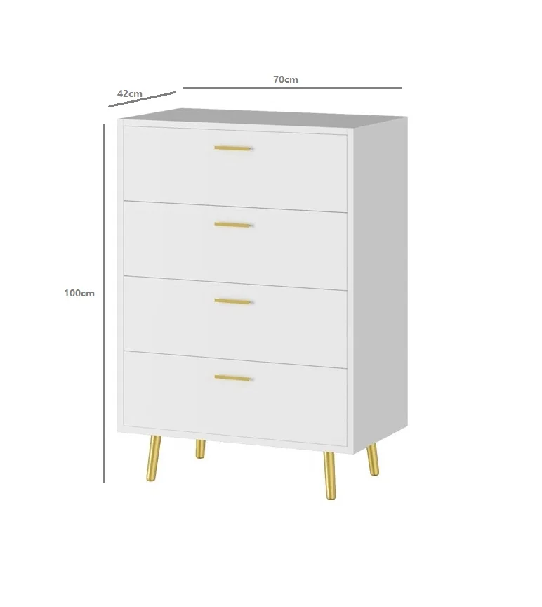 La Cómoda Tadeo es un mueble de dormitorio que destaca por su diseño moderno y elegante, pensado para quienes buscan estilo y funcionalidad en un solo producto. Su acabado en color Blanco aporta luminosidad y frescura al ambiente, mientras que los tiradores y patas en color Dorado añaden un toque de distinción y sofisticación, convirtiéndola en una pieza decorativa que realza cualquier espacio. Su formato vertical hace que sea ideal para optimizar el espacio, manteniendo una presencia estilizada y armoniosa en la habitación. Fabricada en melamina de 18 mm, asegura gran resistencia, durabilidad y calidad.