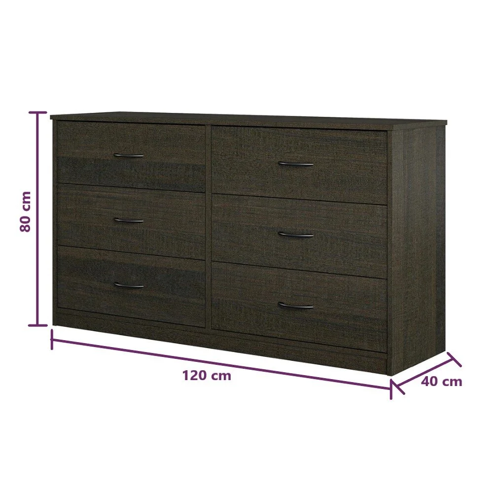 La Cómoda Tapi es un mueble práctico que ofrece gran capacidad de organización gracias a sus 6 cajones amplios, perfectos para guardar ropa, accesorios y otros objetos personales de manera ordenada. Sus correderas telescópicas aseguran un deslizamiento suave y resistente, incluso con un uso constante, aportando comodidad en el día a día. Su diseño horizontal permite aprovechar el espacio disponible de forma eficiente, convirtiéndose no solo en un mueble de almacenamiento, sino también en una pieza funcional que aporta orden, practicidad y estilo moderno al dormitorio.