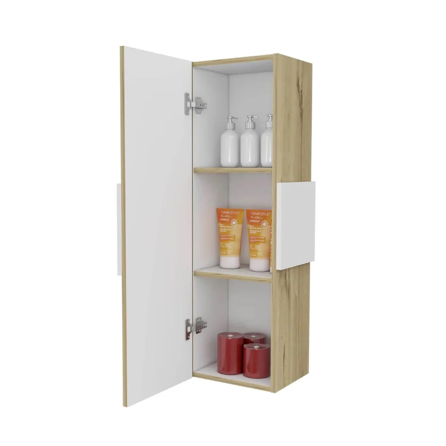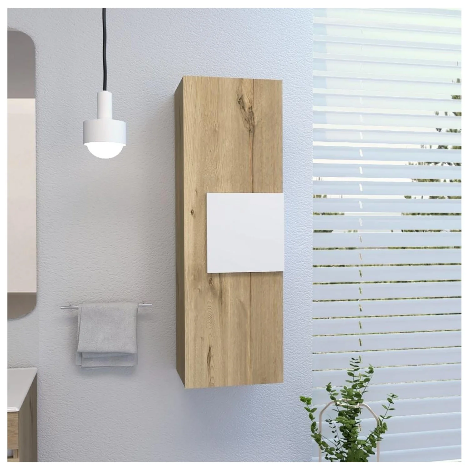 El Estante Gago combina el elegante contraste del blanco y el tono Duna, creando una pieza de diseño moderno que aporta frescura y estilo al baño. Su formato vertical maximiza la altura del espacio y su puerta sin tirador refuerza una estética limpia y minimalista. Fabricado en melamina de 18 mm, ofrece resistencia y un acabado de gran calidad, ideal para complementar ambientes contemporáneos.