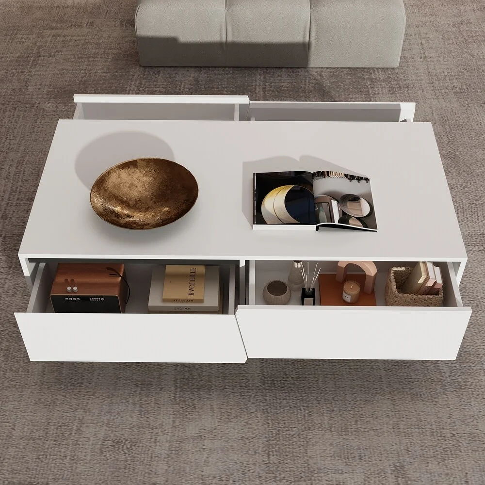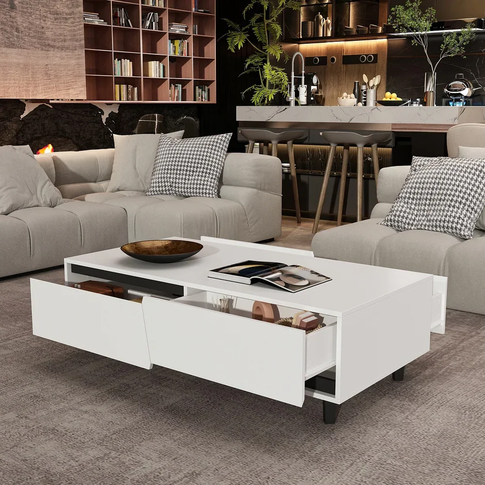 Fabricada en melamina de 18 mm, la Mesa de Centro Aziel ofrece una funcionalidad destacada con cuatro cajones con correderas telescópicas, que brindan un almacenamiento práctico y accesible. Su amplio espacio permite organizar de manera eficiente tus objetos decorativos, libros y otros accesorios, haciendo de este mueble una excelente opción para quienes buscan una mesa de centro que combine funcionalidad, estilo y durabilidad.