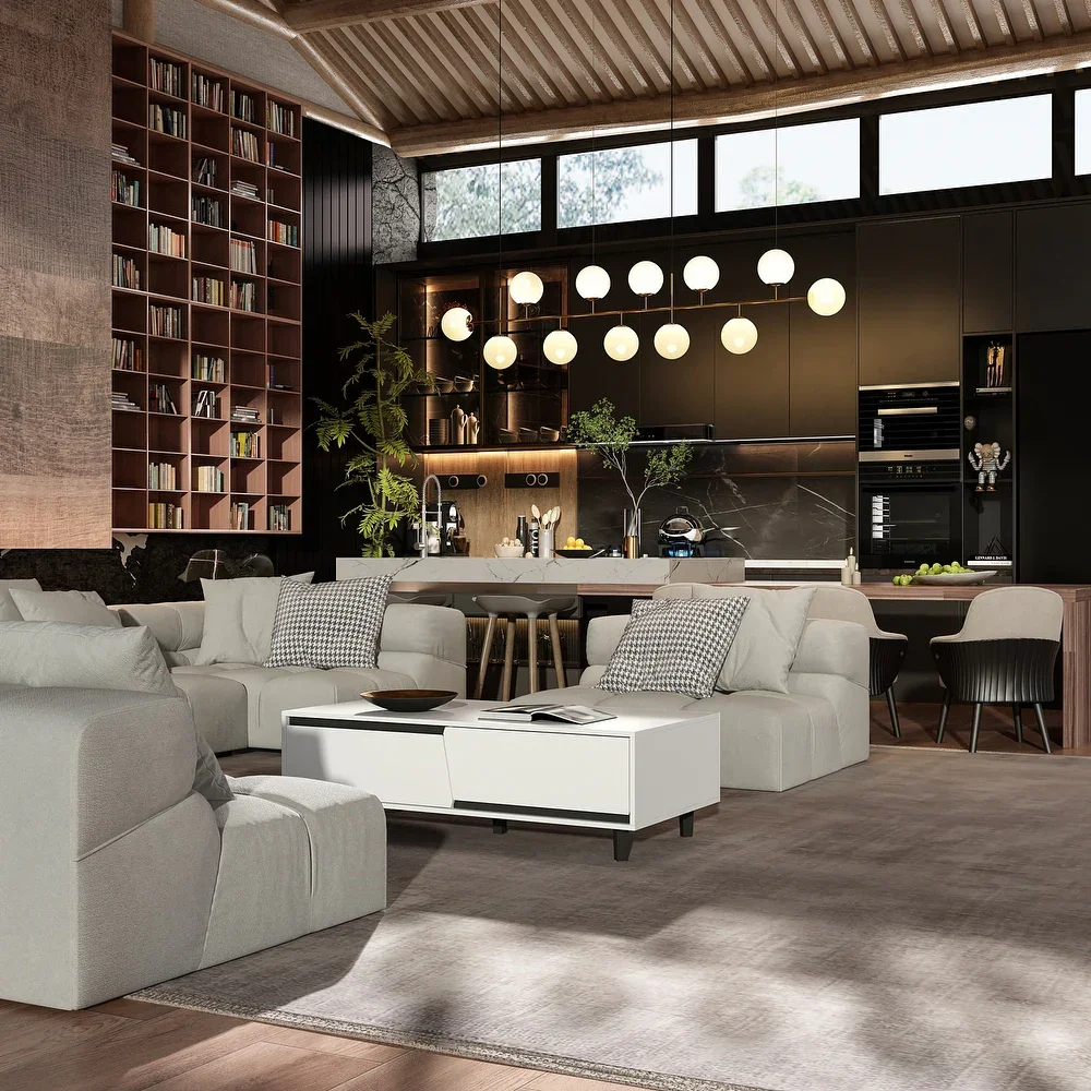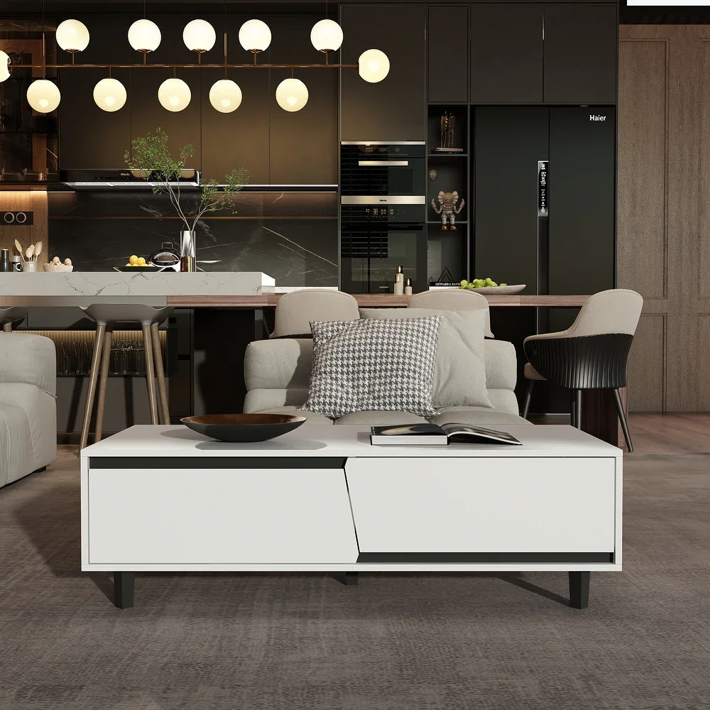 La Mesa de Centro Aziel se caracteriza por su diseño moderno y sofisticado en color blanco y negro, que le otorga un toque contemporáneo y elegante. Las patas de madera negras aportan estabilidad y un contraste visual atractivo, complementando perfectamente la estructura sin tiradores, lo que refuerza el estilo minimalista. Esta pieza es ideal para quienes buscan un mueble funcional, pero que no renuncia al estilo y la modernidad.