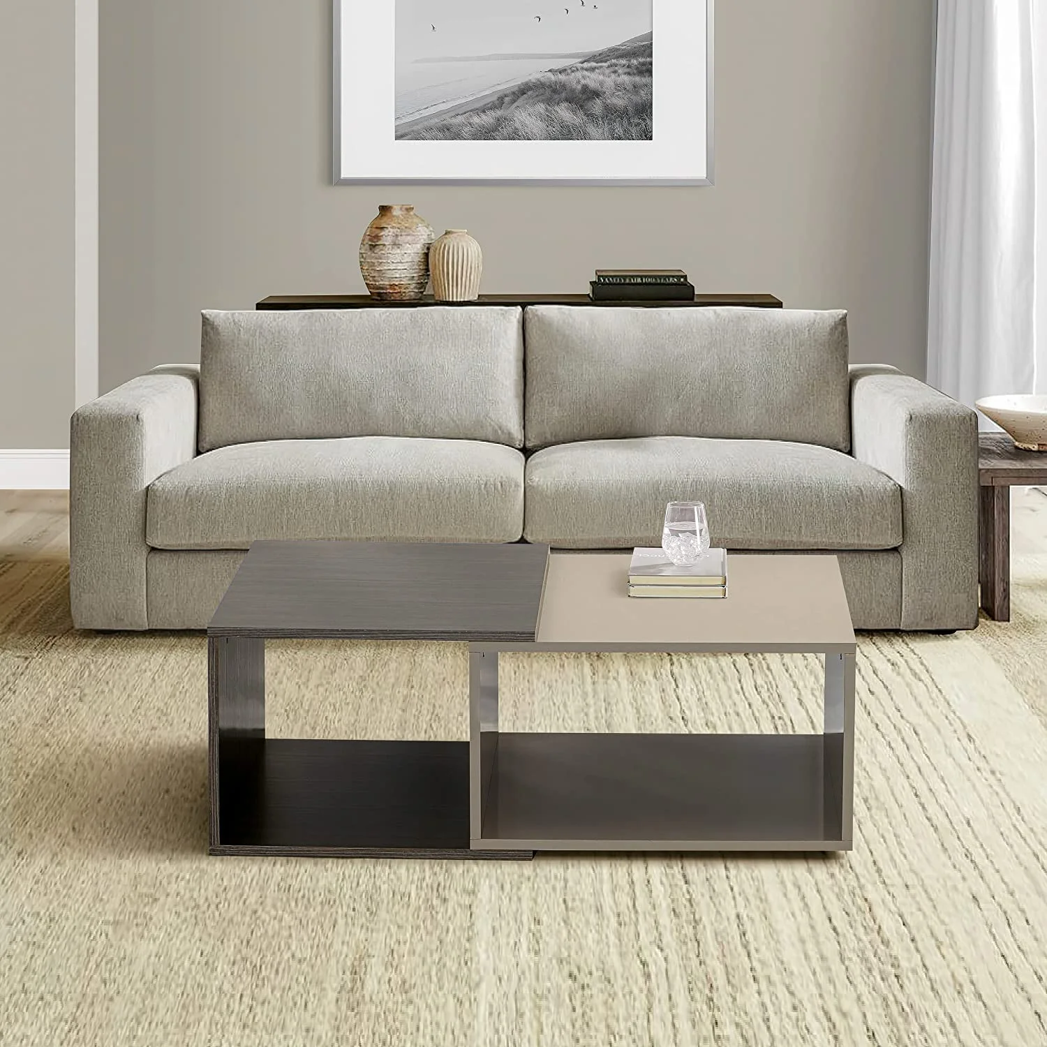 La Mesa de Centro Doppia destaca por su diseño elegante y minimalista, pensado para quienes buscan un mueble moderno y sofisticado. Su acabado en color Taupe y Nogal Amazónico crea un contraste atractivo que aporta calidez y estilo a la sala, convirtiéndose en una pieza decorativa que realza cualquier ambiente. Fabricada en melamina de 18mm, no solo resalta por su apariencia refinada, sino también por su durabilidad y resistencia, garantizando un mueble funcional y de gran presencia estética.