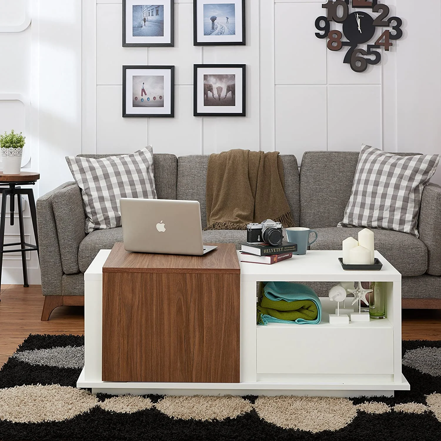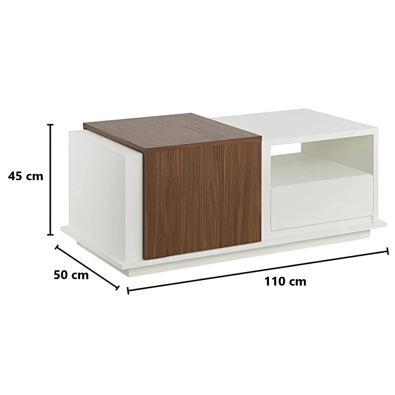 La Mesa de Centro Kith combina modernidad y practicidad en un diseño pensado para realzar cualquier sala. Su acabado en color Blanco y Nogal aporta un contraste elegante y versátil, capaz de integrarse con distintos estilos de decoración. Su estructura limpia y contemporánea, junto con sus líneas rectas y proporciones equilibradas, la convierten en una pieza que no solo cumple su función, sino que también actúa como un elemento decorativo de gran presencia. Además, cuenta con una tapa deslizable con correderas telescópicas, que le da un toque innovador y distintivo frente a las mesas tradicionales.