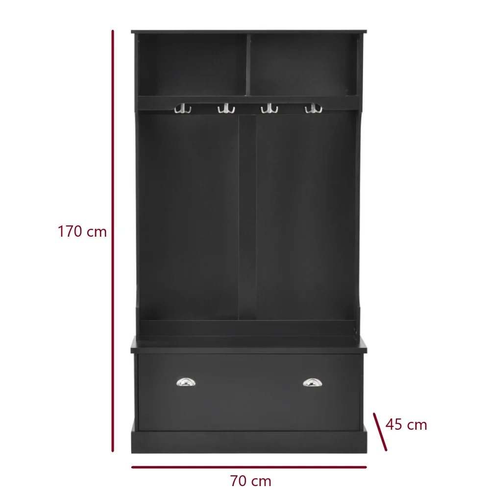 El Perchero Quintana está fabricado en melamina 18mm, lo que le confiere resistencia y durabilidad. Cuenta con 4 pares de perchas, lo que lo convierte en una excelente opción para colgar abrigos, chaquetas y otros accesorios. En su parte superior, dispone de un amplio espacio que permite organizar objetos o incluso decorar con plantas o adornos. Además, la área inferior incluye una puerta horizontal, ideal para almacenar objetos de forma discreta y ordenada. Su diseño práctico y robusto asegura que este perchero no solo sea una solución funcional, sino también una pieza decorativa resistente.