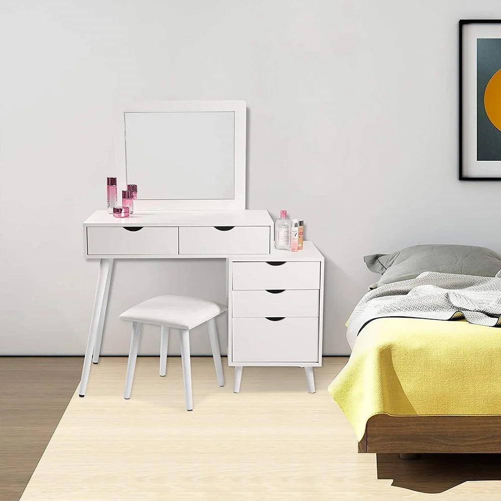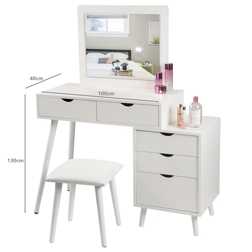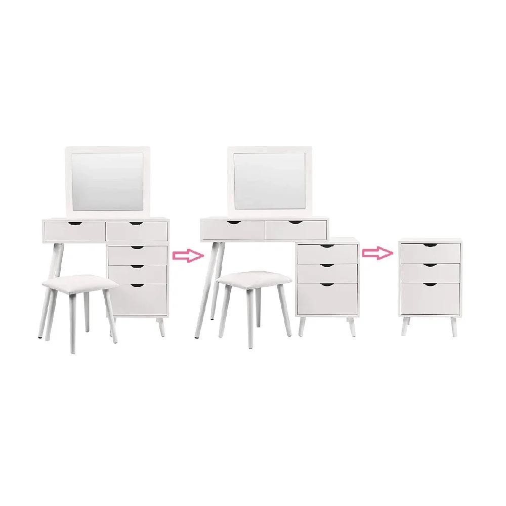 El Tocador Dranda ofrece gran practicidad gracias a sus 5 cajones amplios con correderas telescópicas, perfectos para organizar maquillaje, accesorios, perfumes y todo tipo de objetos personales. Su distribución permite mantener cada cosa en orden y siempre al alcance de la mano. El espejo integrado facilita la rutina diaria de belleza y cuidado personal, haciendo de este mueble una solución versátil, funcional y cómoda para cualquier dormitorio.