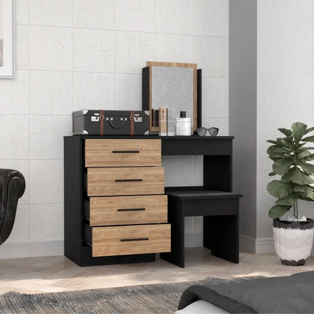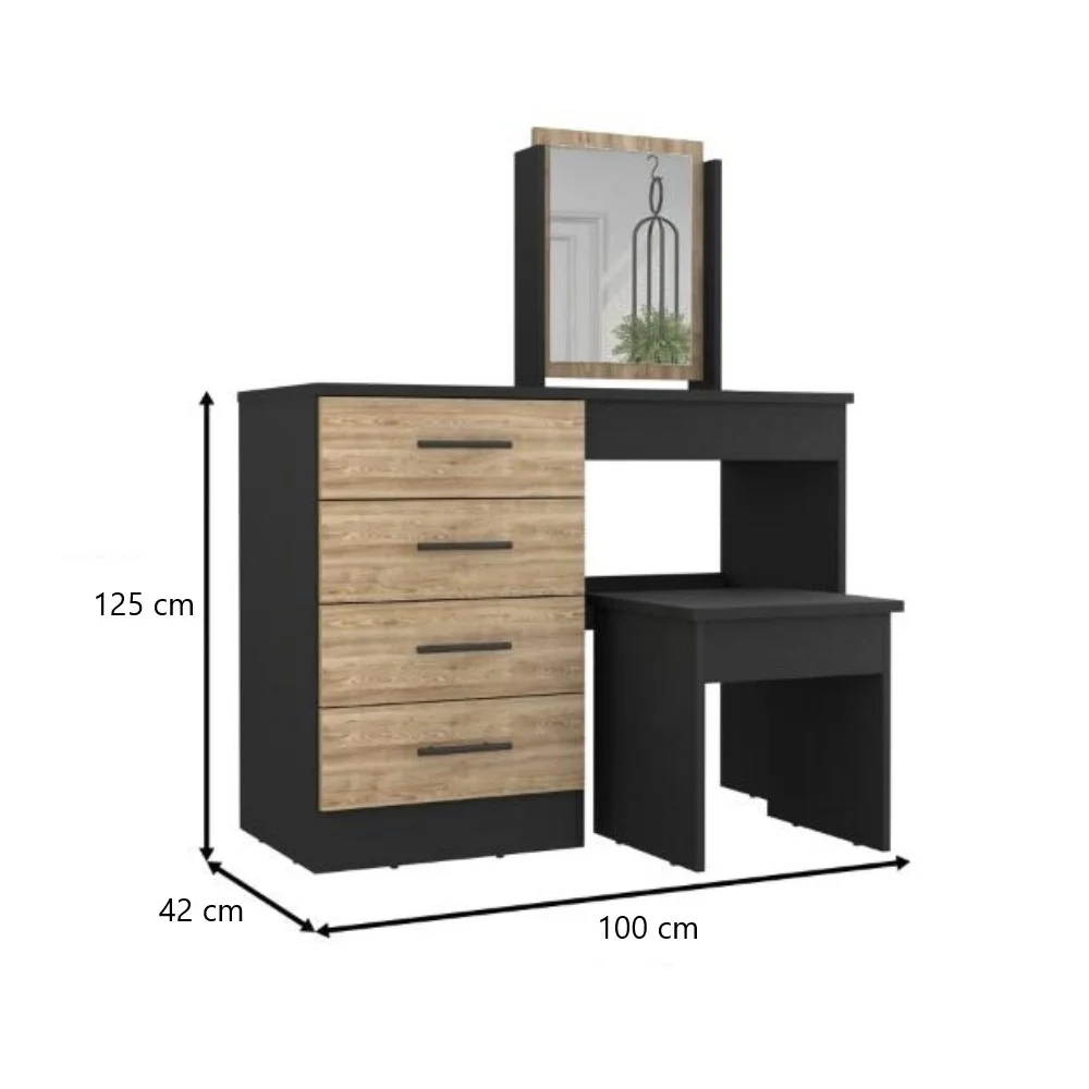El Tocador Palma destaca por su diseño elegante que combina el sofisticado color Negro con el cálido maderado Panela, creando un contraste perfecto y lleno de estilo. Su bonito espejo no solo añade funcionalidad, sino que también realza la estética del mueble, convirtiéndolo en un punto focal de cualquier habitación. Los finos detalles y acabados cuidadosamente trabajados hacen del Tocador Palma una pieza única, ideal para quienes buscan añadir un toque de sofisticación y carácter a su espacio personal.