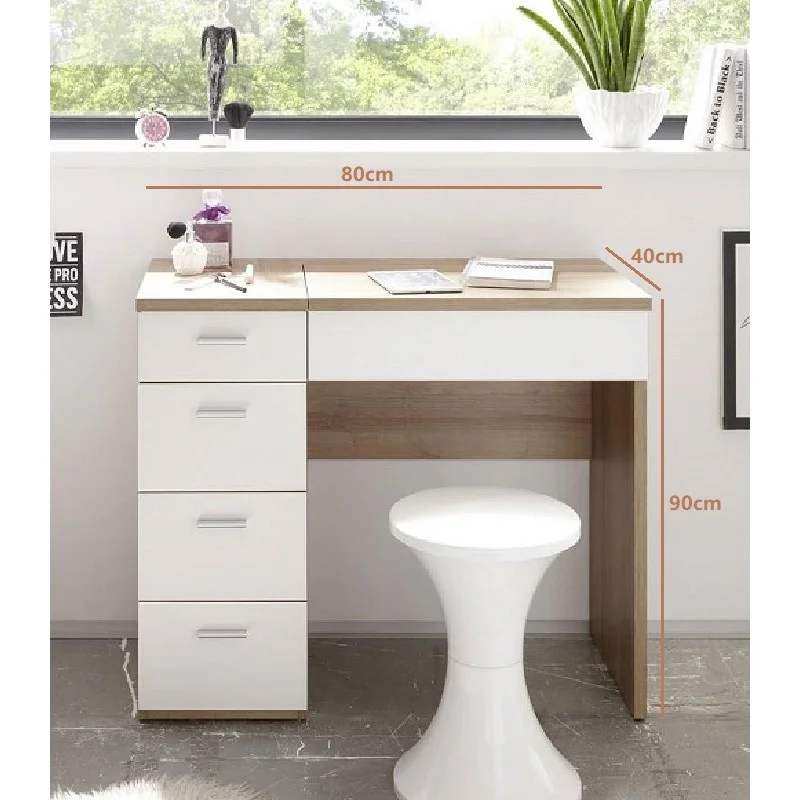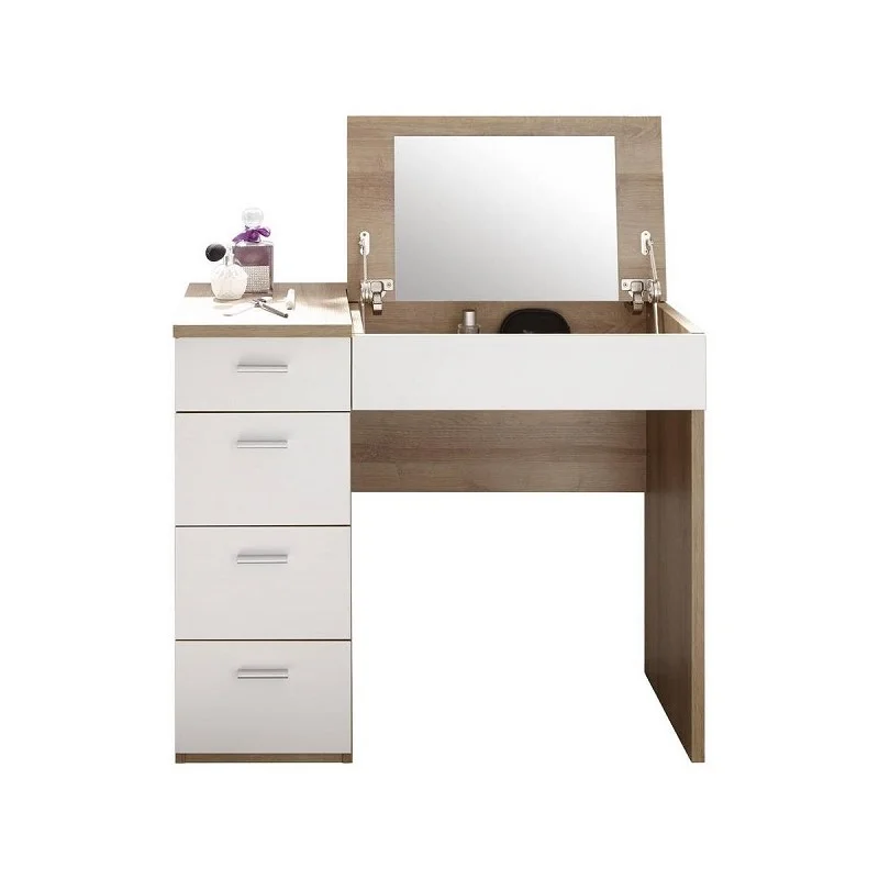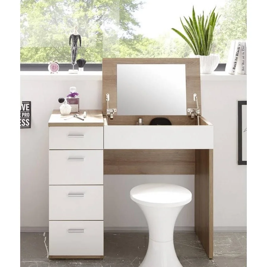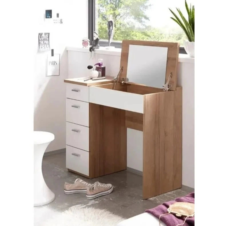 Más allá de su apariencia, el Tocador Tefy está diseñado para ofrecer organización y practicidad en el día a día. Incorpora un práctico compartimento oculto debajo de la tapa, ideal para guardar accesorios, maquillaje o productos de uso personal de manera ordenada y siempre a la mano. Además, cuenta con 4 cajones amplios con correderas telescópicas, que facilitan un deslizamiento suave y permiten aprovechar al máximo el espacio de almacenamiento. Su espejo integrado facilita las rutinas de cuidado personal, mientras que su diseño compacto pero espacioso lo hace perfecto para mantener todo en orden sin ocupar demasiado lugar en la habitación.