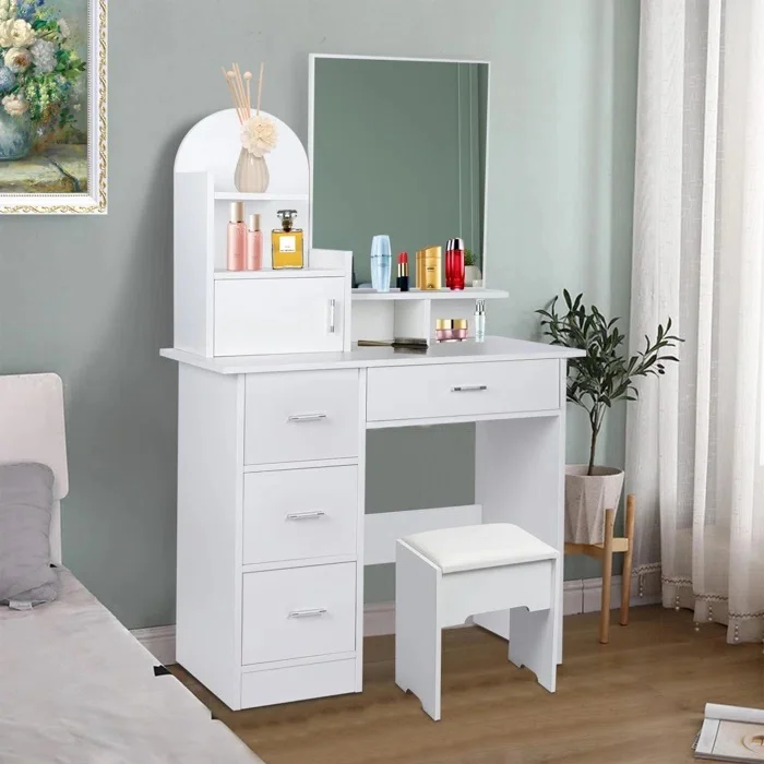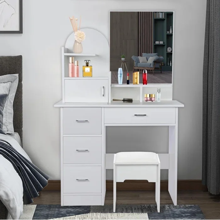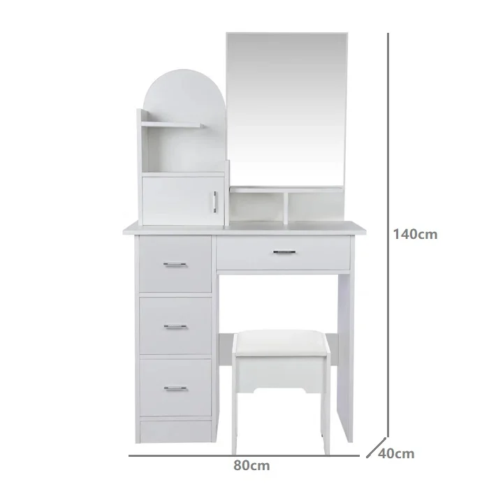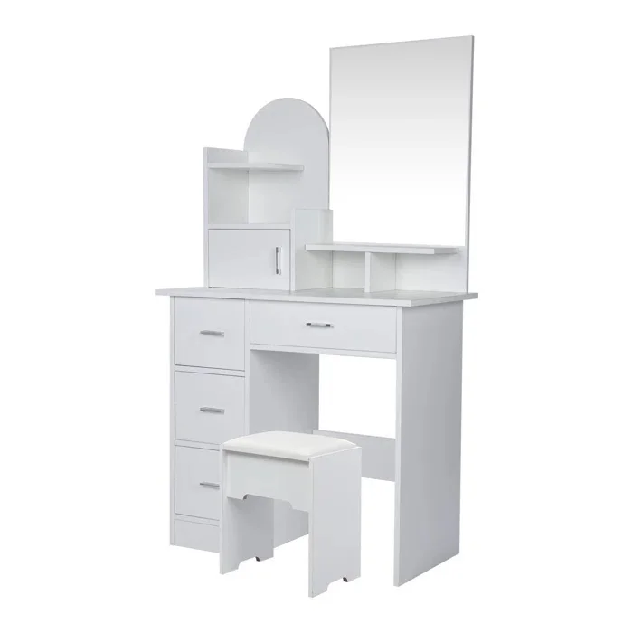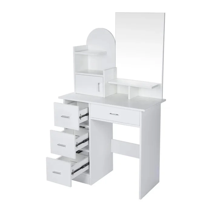 El Tocador Xiana no solo es decorativo, sino también altamente funcional. Sus 4 cajones con correderas telescópicas proporcionan un espacio de almacenamiento amplio y cómodo, ideal para organizar maquillaje, accesorios, perfumes o artículos de cuidado personal. Además, incluye un asiento tapizado en color blanco, que brinda comodidad y se integra con elegancia al conjunto. El espejo integrado facilita las rutinas diarias, convirtiéndolo en un aliado perfecto para prepararse cada día con practicidad y estilo. Su diseño compacto pero espacioso lo hace perfecto para mantener el orden sin sacrificar la estética del dormitorio.