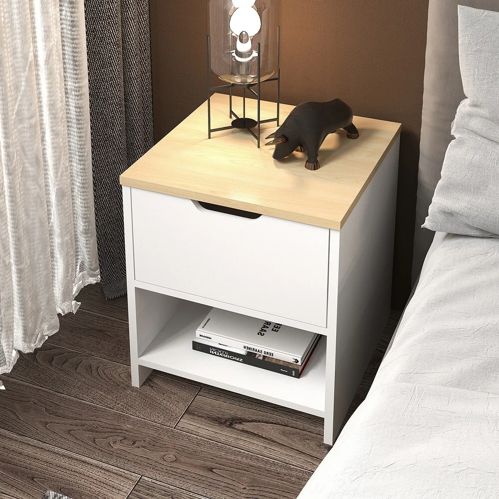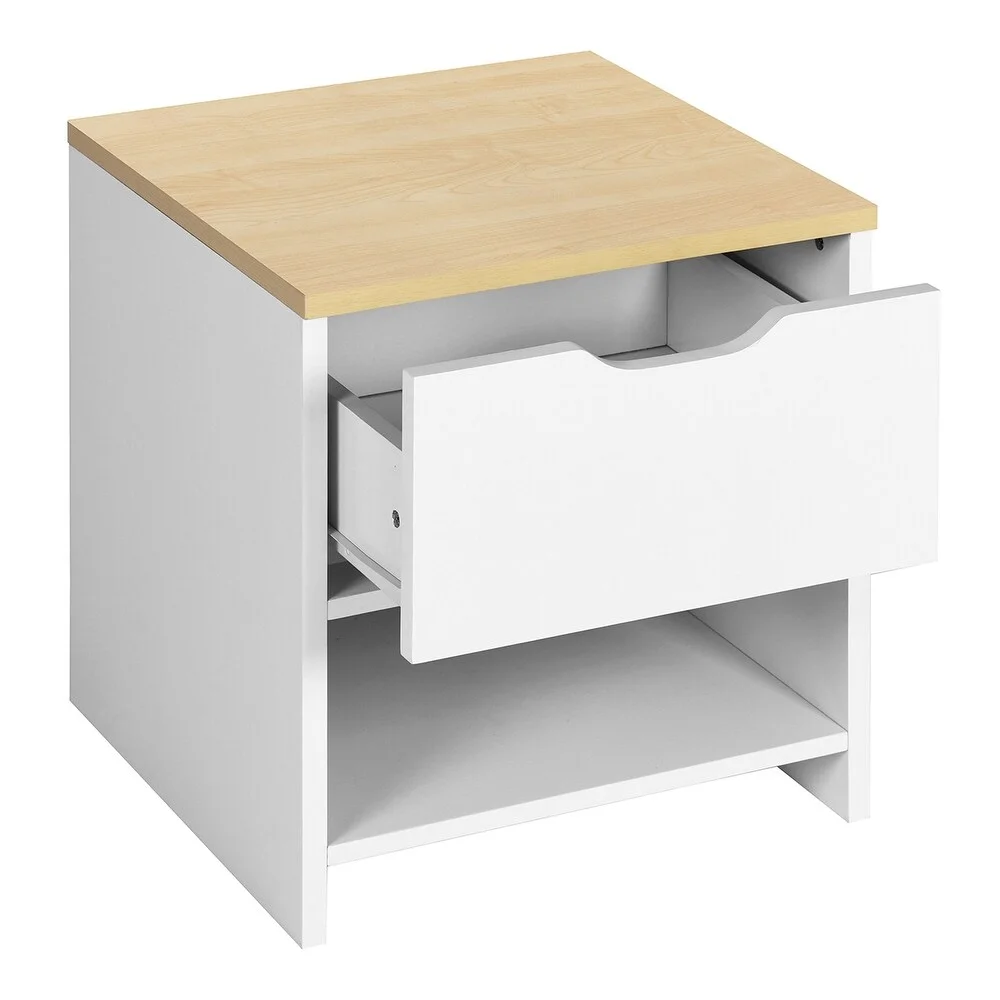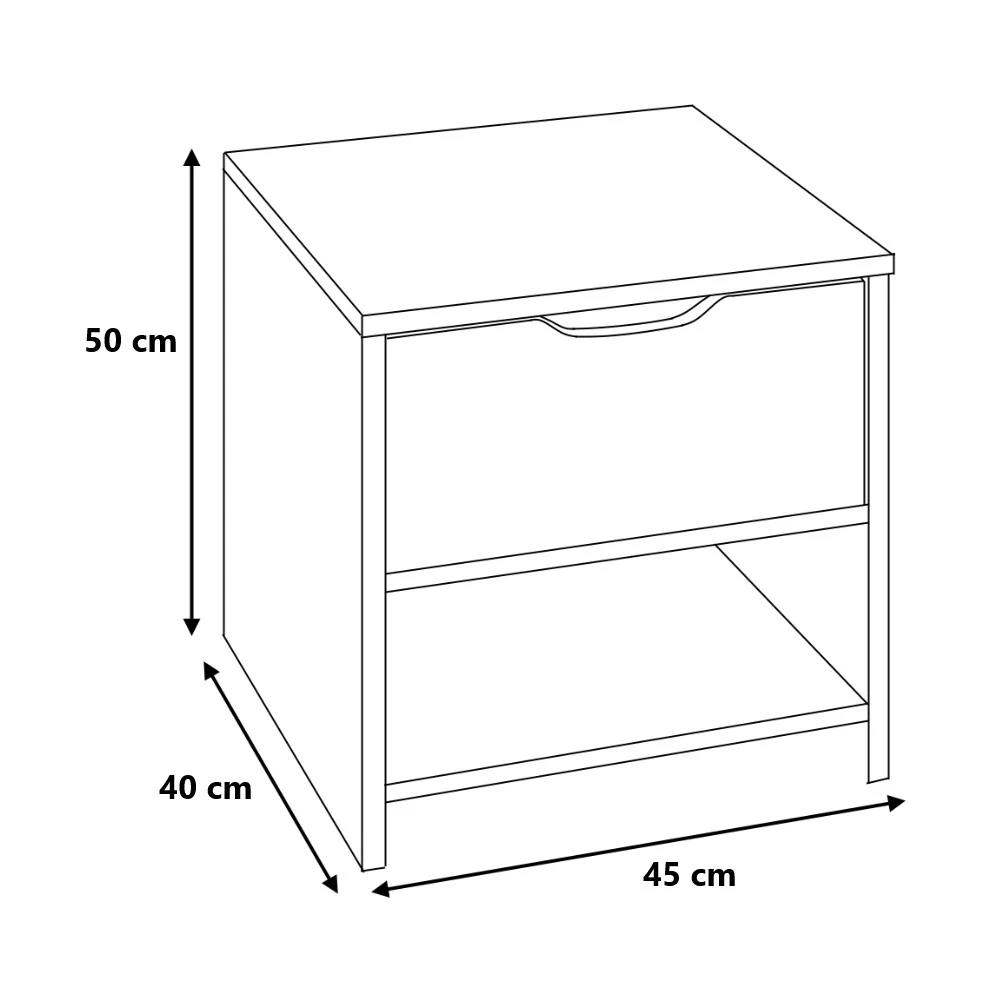 Cuenta con un cajón con correderas telescópicas, ideal para guardar de manera segura y organizada objetos personales, accesorios o artículos de uso diario. Su sistema de apertura sin tiradores hace que su uso sea sencillo y cómodo, manteniendo una estética limpia. Es una pieza compacta pero de gran utilidad, pensada para optimizar el espacio y aportar comodidad en la rutina diaria, convirtiéndose en el complemento ideal para tu dormitorio.