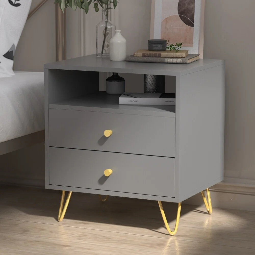 El Velador Riba destaca por su diseño moderno y elegante en color gris grafito, complementado con patas y tiradores de metal en color dorado que aportan un contraste elegante y un toque de sofisticación. Su diseño minimalista y líneas refinadas lo convierten en una pieza única que aporta clase y estilo a cualquier habitación, añadiendo una atmósfera de lujo y confort.