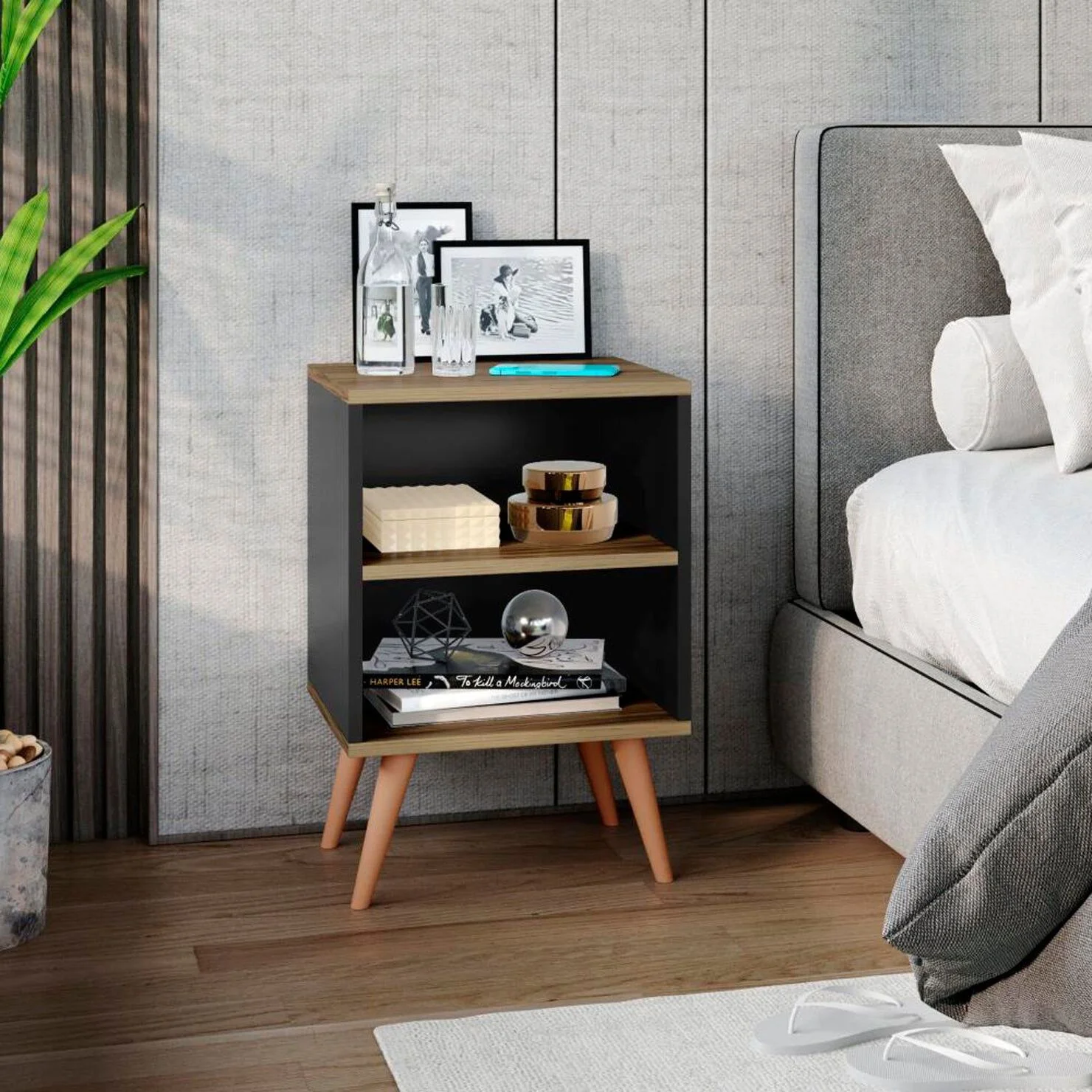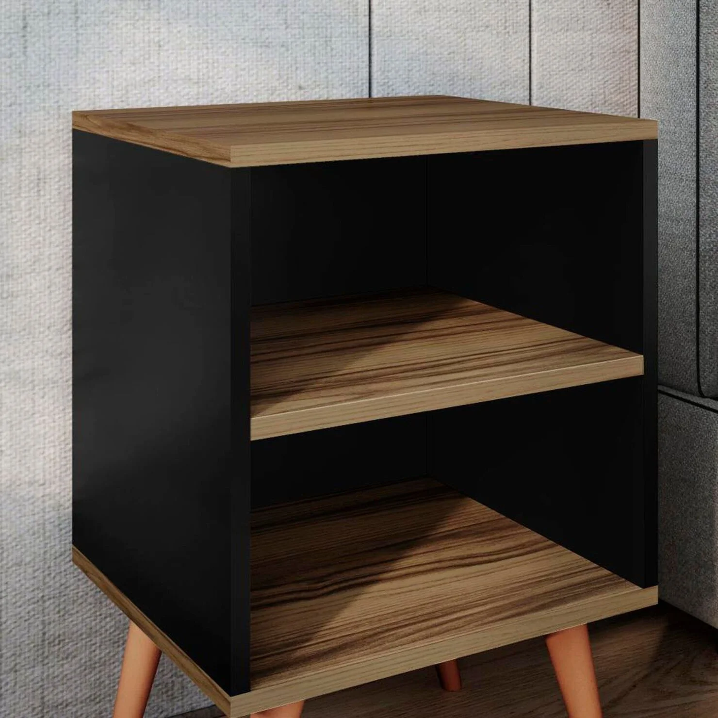 El Velador Rilux destaca por su diseño moderno y sobrio, combinando el elegante color Negro con un acento en Sangría, lo que le otorga un estilo distintivo y sofisticado. Su estructura cuadrada aporta firmeza y equilibrio visual, mientras que las patas de madera complementan el conjunto con un toque natural que realza su estética. Fabricado en melamina de 18 mm, garantiza resistencia y acabados de calidad para integrarse fácilmente en distintos estilos de dormitorio.