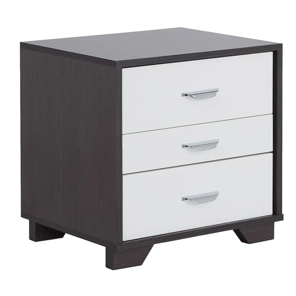 El Velador Romero destaca por su diseño moderno y elegante, combinando el color Blanco con el tono Wengue para crear un contraste sofisticado y versátil que se adapta a diferentes estilos de dormitorio. Sus tiradores plateados aportan un detalle refinado y contemporáneo, mientras que la melamina de 18 mm asegura solidez y durabilidad. Sus finos acabados lo convierten en una pieza decorativa que realza la armonía del espacio.