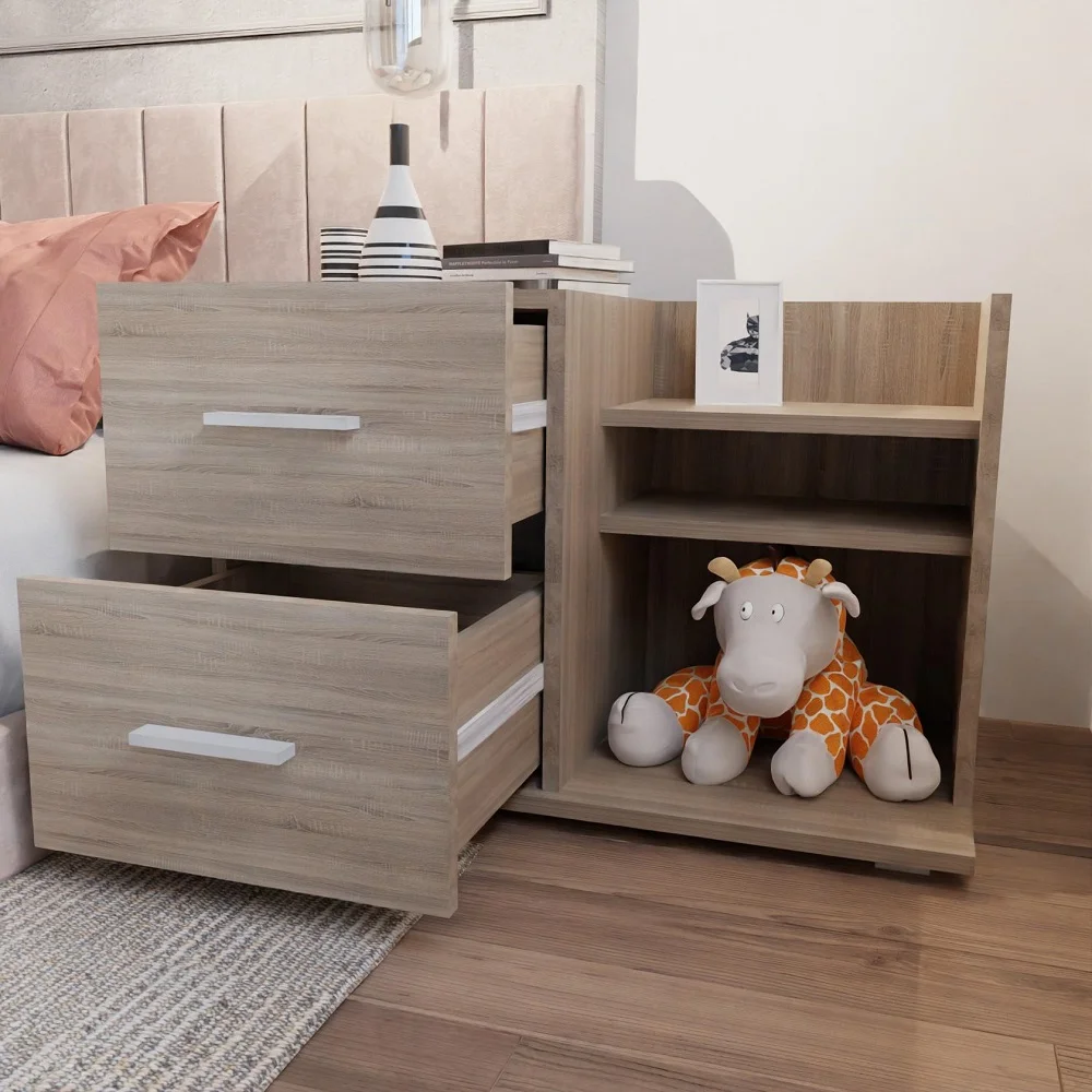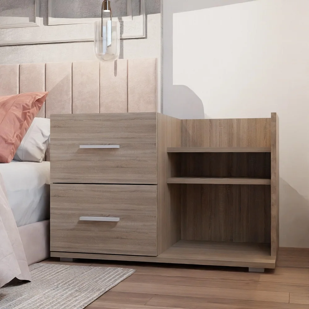 Este velador ha sido creado pensando en la practicidad del día a día. Sus dos cajones con correderas telescópicas proporcionan un amplio espacio de almacenamiento, perfecto para organizar objetos personales, accesorios o elementos de uso frecuente, manteniendo todo al alcance de la mano. Su diseño funcional lo convierte en una pieza versátil, ideal para quienes buscan comodidad sin sacrificar elegancia.