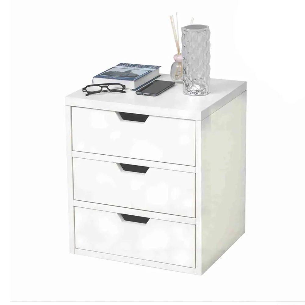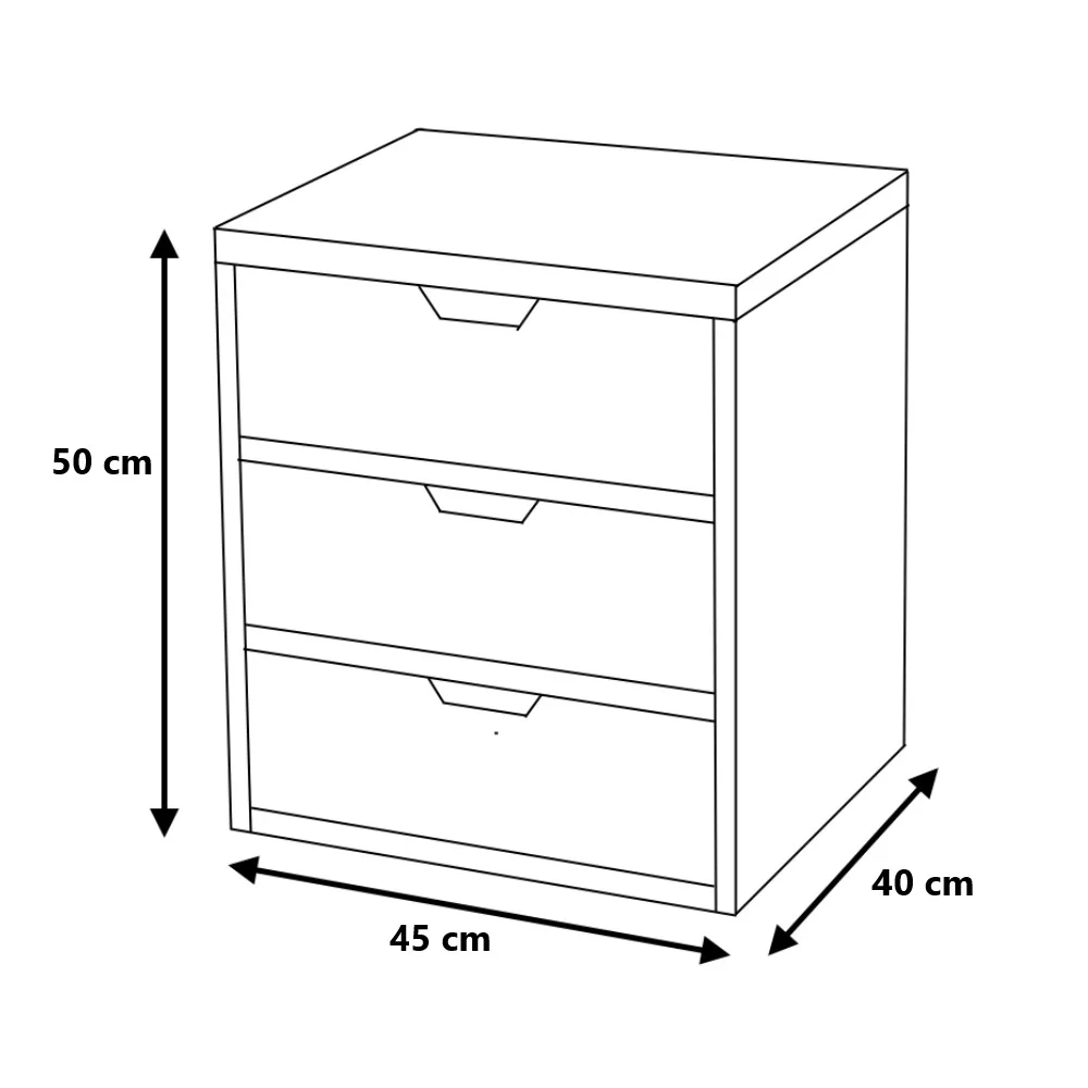 Cuenta con tres cajones con correderas telescópicas, que garantizan un movimiento suave y seguro, perfectos para guardar desde objetos pequeños hasta artículos de uso diario. Su estructura en melamina de 18mm ofrece resistencia y durabilidad, asegurando un mueble sólido y confiable para el día a día. Gracias a su diseño cuadrado y compacto, aprovecha el espacio de forma eficiente, convirtiéndose en un velador práctico, funcional y elegante para acompañar tu descanso.