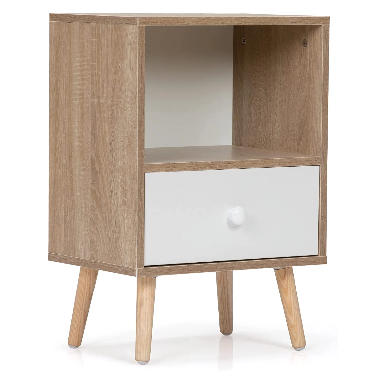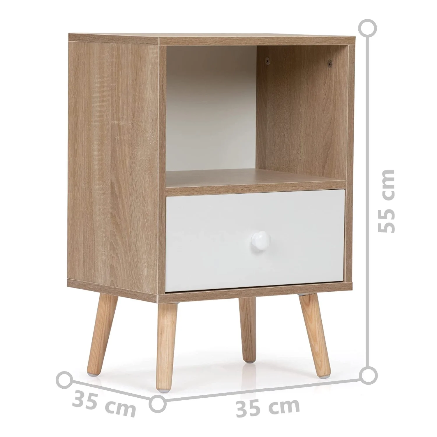 El Velador Solomon, en color Blanco y Duna, presenta un diseño moderno y elegante que combina la frescura del blanco con la calidez de los tonos madera. Su tirador en color blanco aporta continuidad al diseño, logrando un aspecto limpio y armonioso. Cada velador se sostiene sobre patas de madera altas, lo que le da ligereza visual y un toque natural que se integra fácilmente en distintos estilos de dormitorio. Fabricado en melamina de 18mm y con finos acabados, este juego de dos veladores refleja calidad, estilo y modernidad en cada detalle.