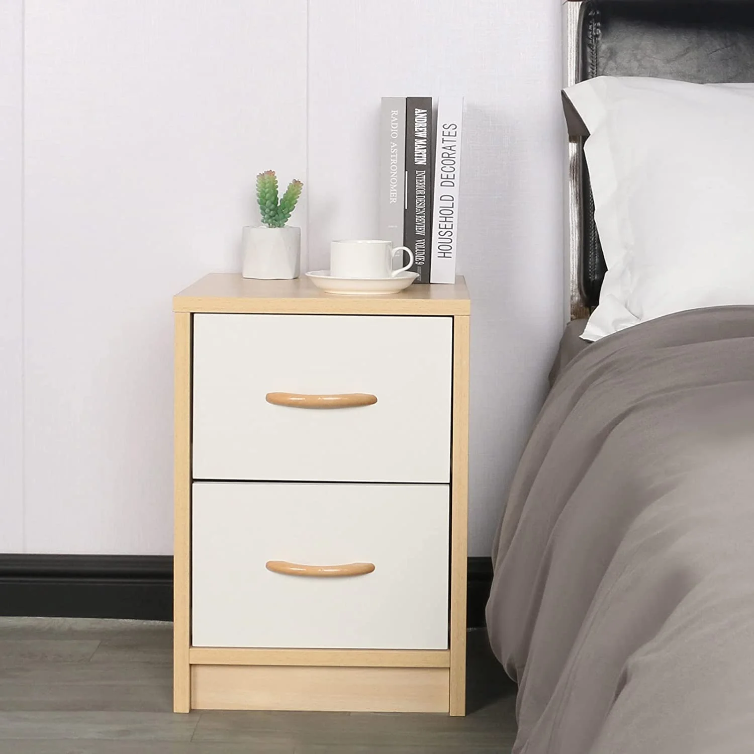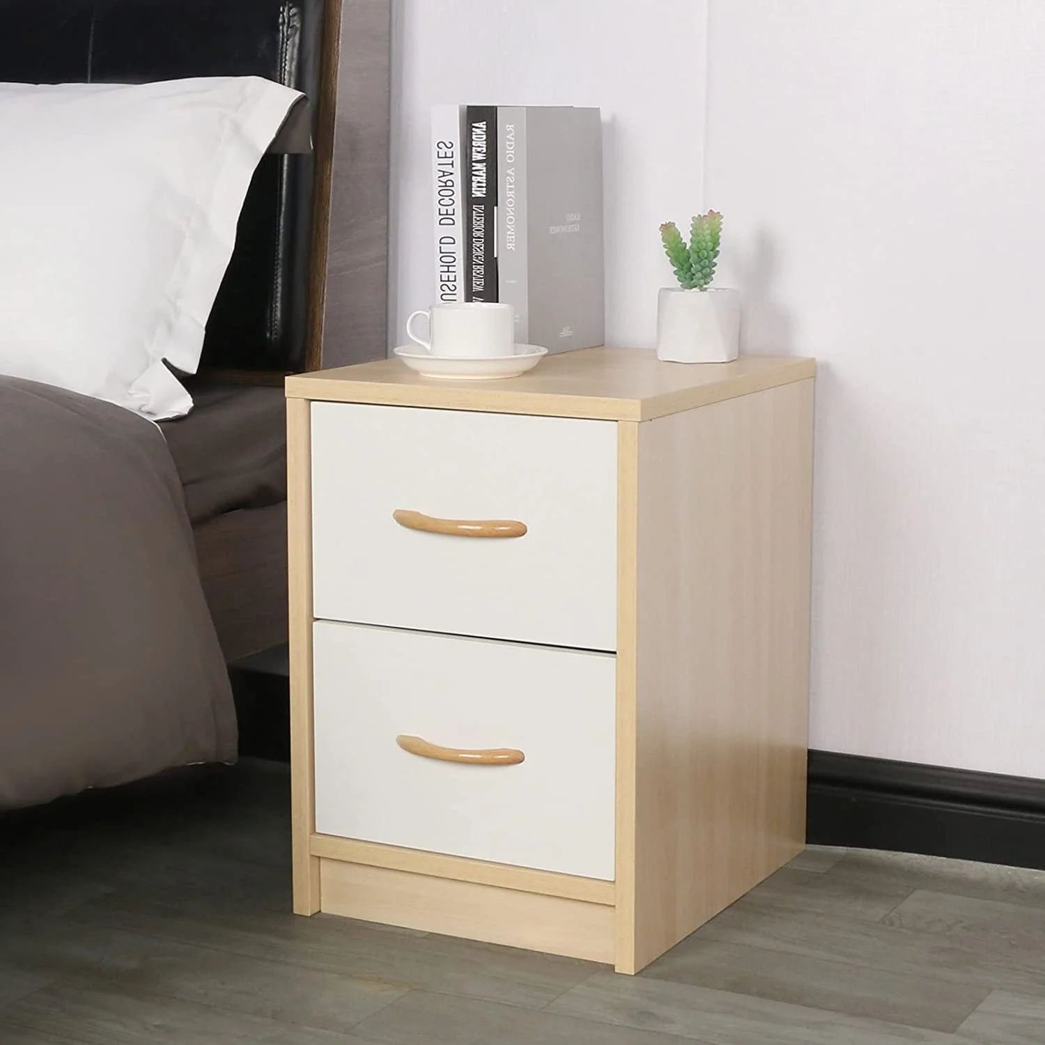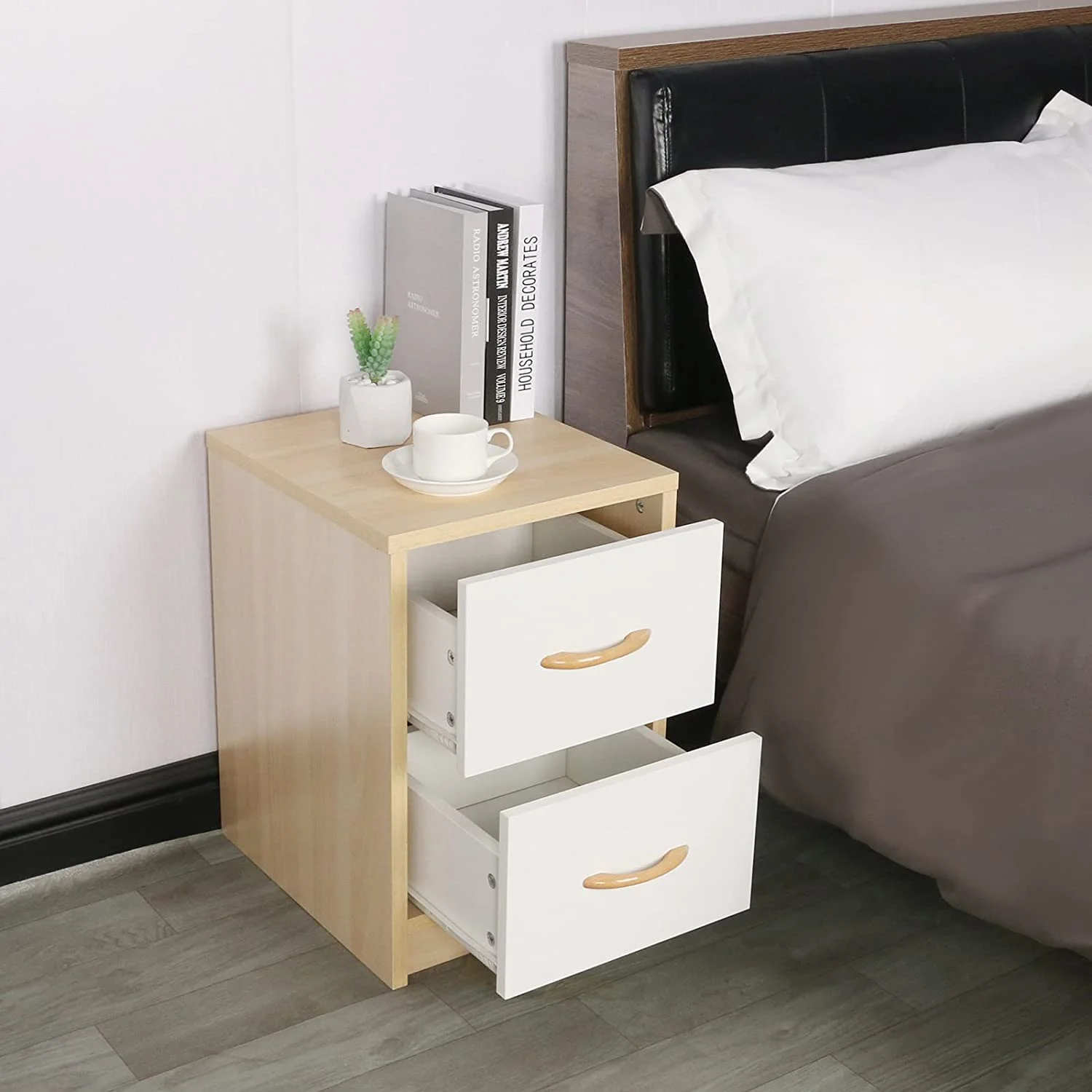 Cuenta con dos cajones con correderas telescópicas, que permiten un deslizamiento suave y seguro, perfectos para mantener en orden objetos personales como documentos, accesorios o dispositivos electrónicos. Además, su superficie superior resulta ideal para colocar lámparas, libros o elementos decorativos, convirtiéndolo en un mueble práctico, versátil y duradero que se adapta a cualquier necesidad.